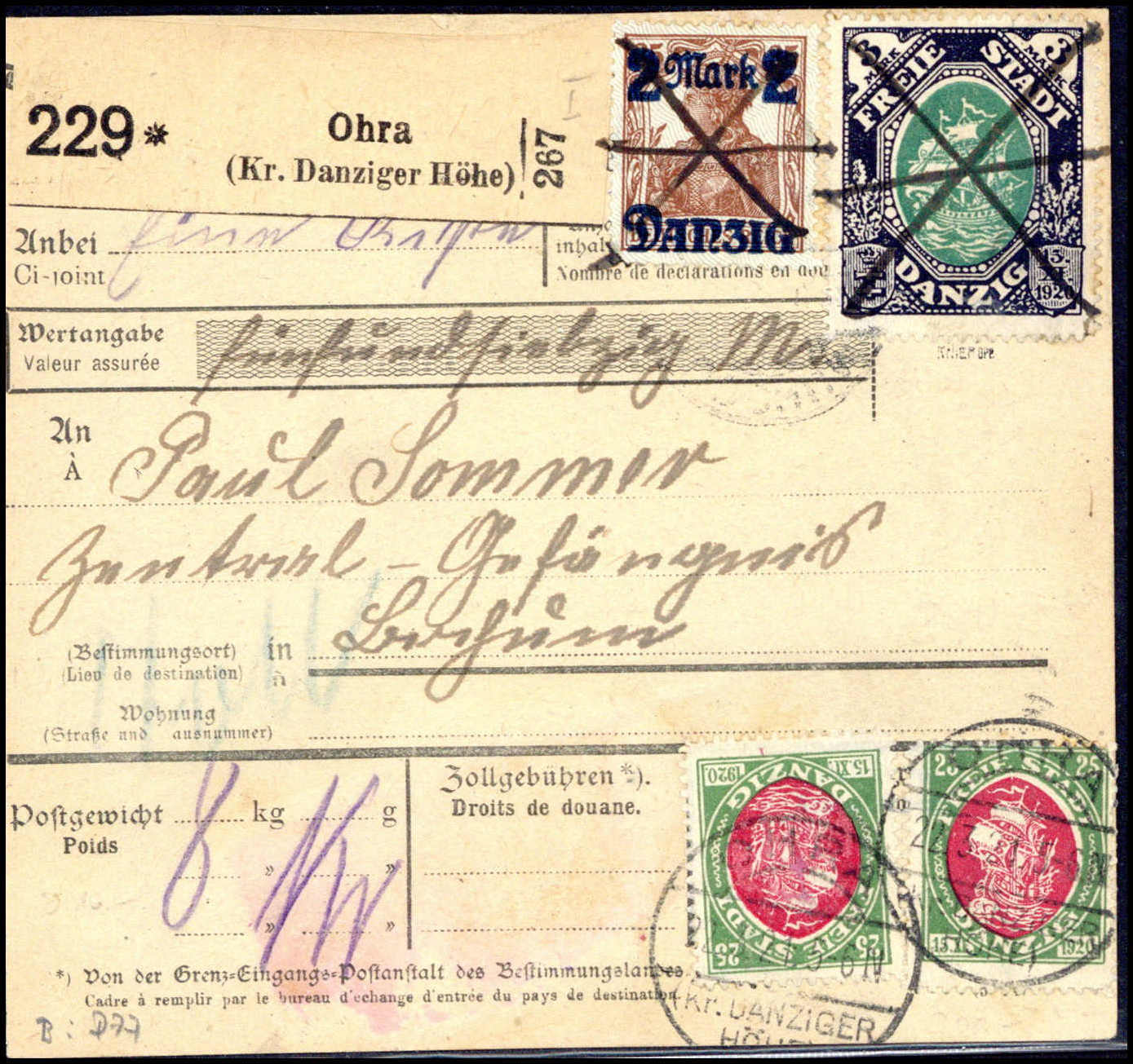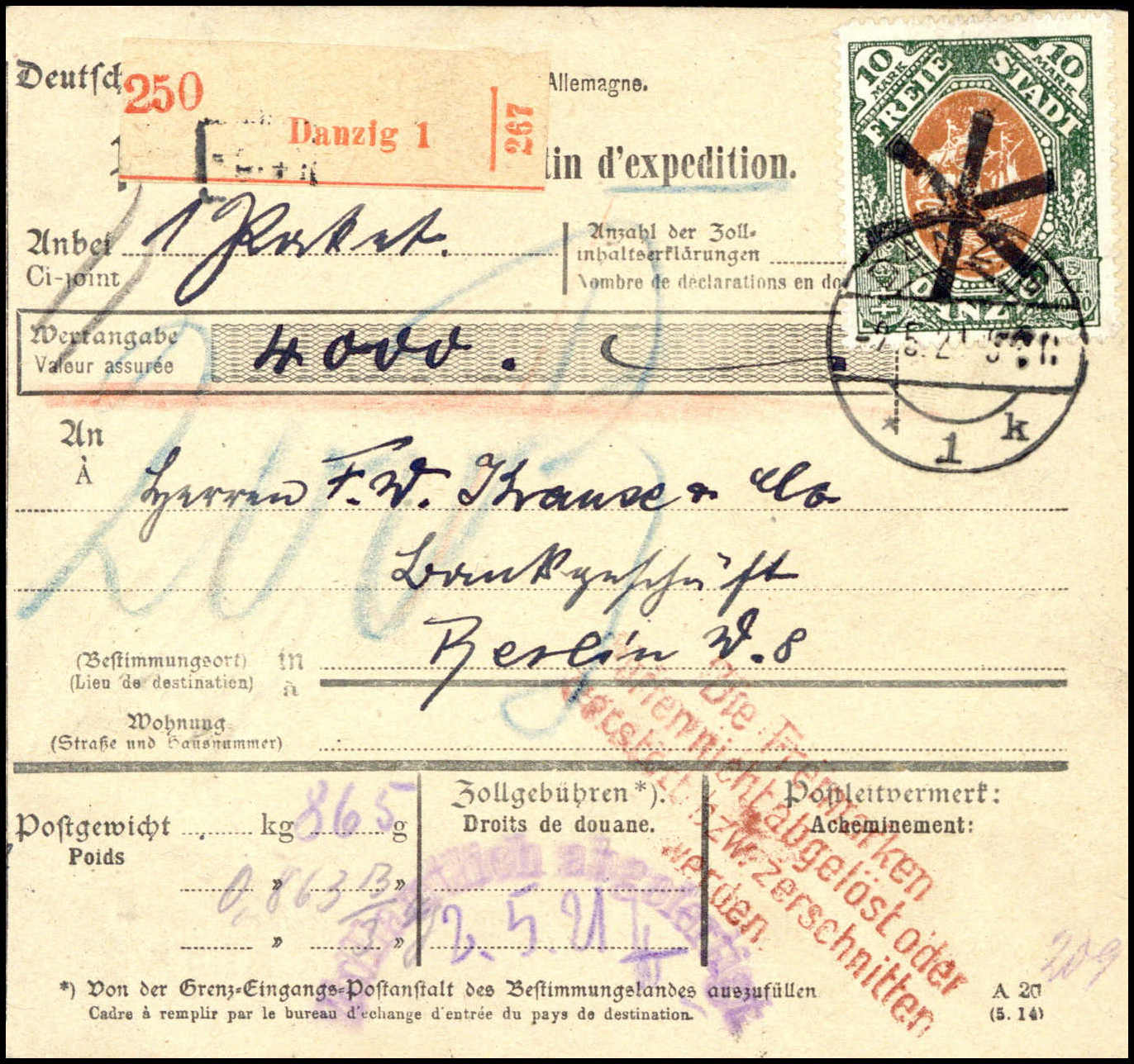 10 Mk. vs. und 3 Mk. rs. auf Wert-Paketkarte über 4.000,- Mark nach Berlin, Stempel DANZIG 2/5 21