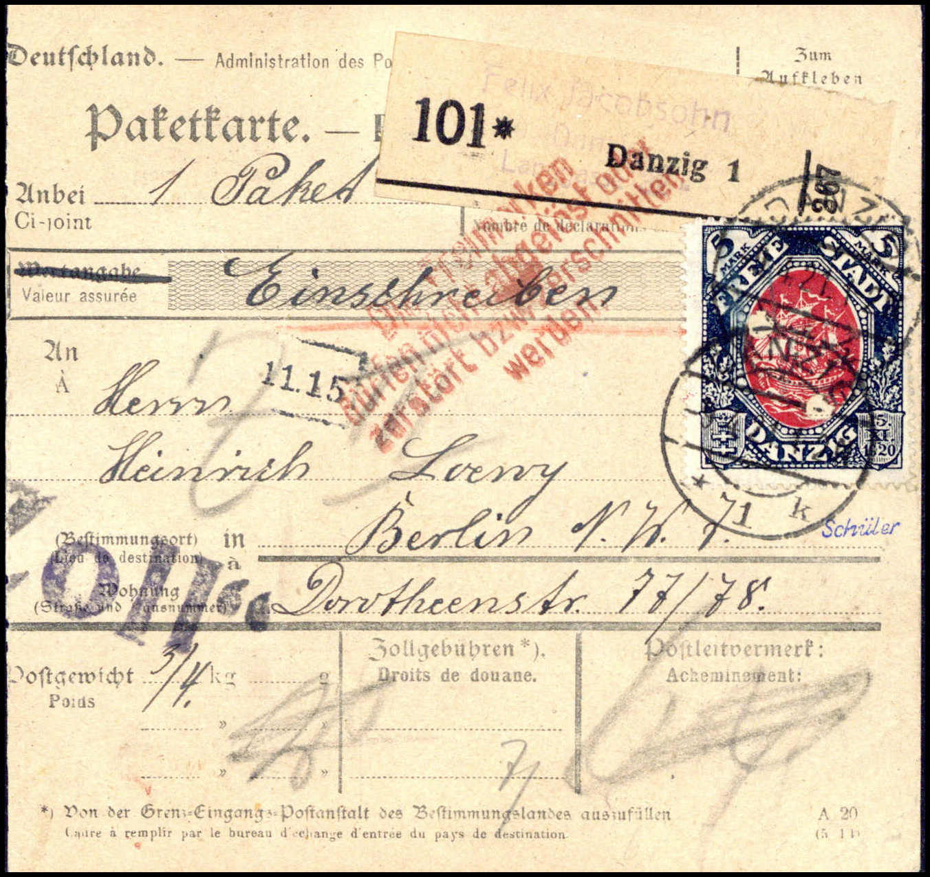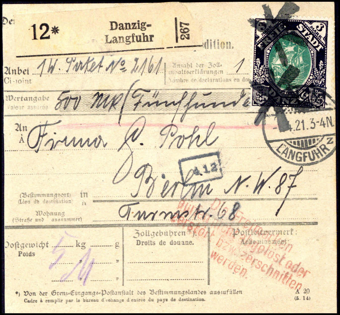 5 Mk., Einzelfrankatur auf Einschreibe-Paketkarte mit Stempel DANZIG 9/4 21 nach Berlin, sign. Schüler