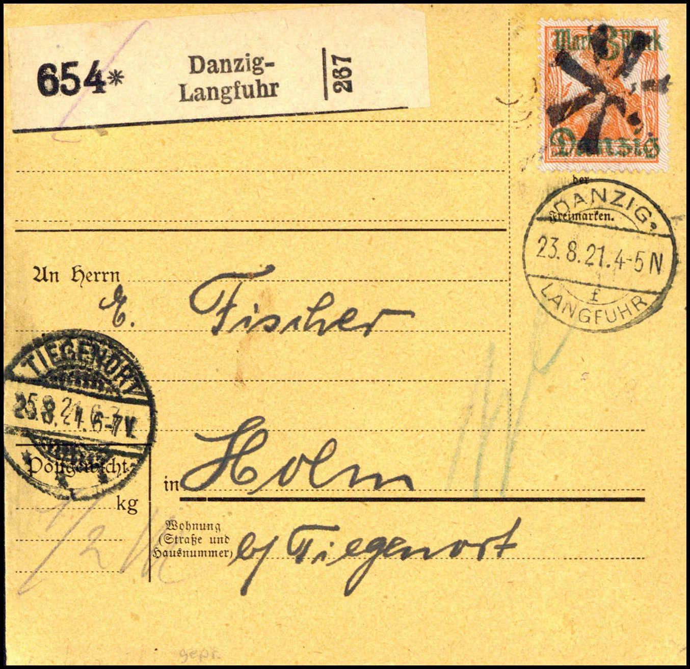 3 Mk. a. 7½ Pfg., Einzelfrankatur mit Sternstpl. und beiges. Aufgabestempel DANZIG LANGFUHR 23/8 21 auf Paketkarte nach Holm