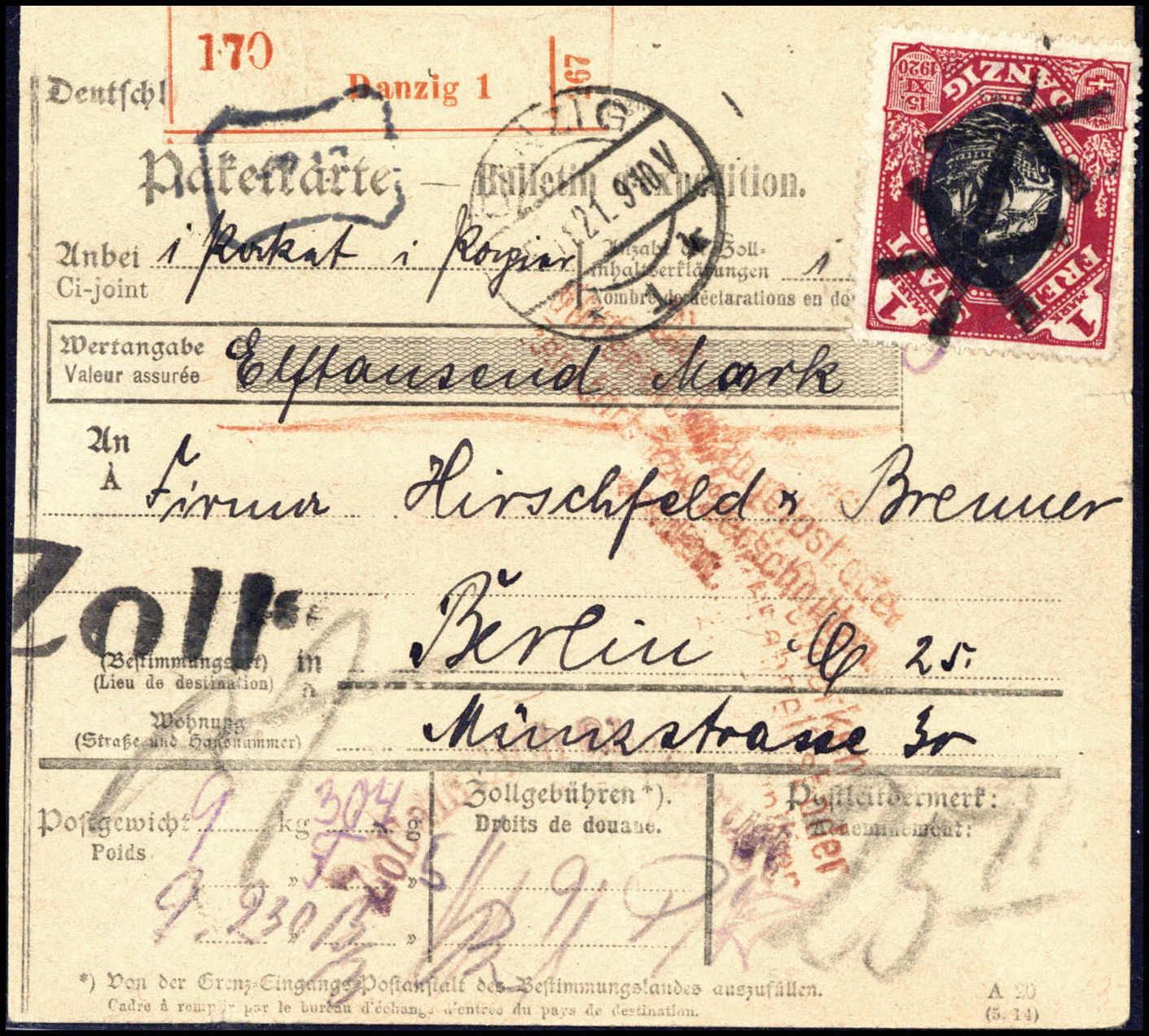 1 Mk. vs. mit Dreierstreifen 10 Mk. rs. auf seltener Wert-Paketkarte über 11.000,- Mark von Danzig 15.11.21 nach Berlin