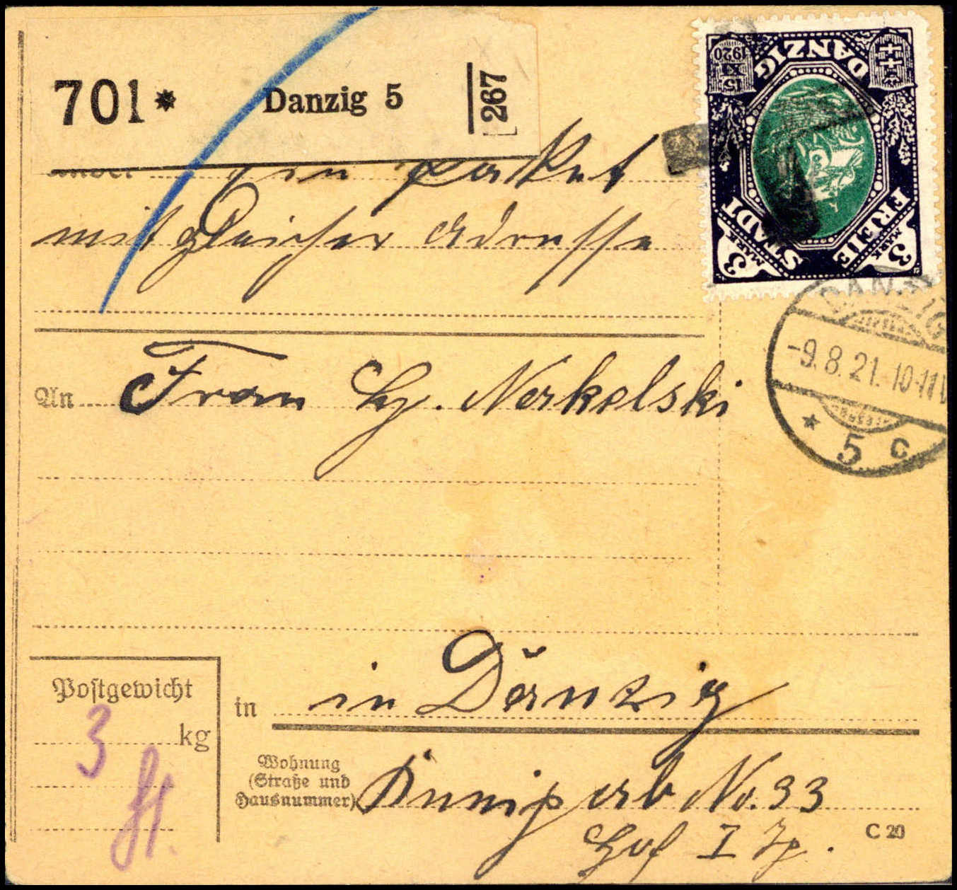 3 Mk., Einzelfrankatur auf seltener Orts-Paketkarte mit Stempel DANZIG 9.8.21