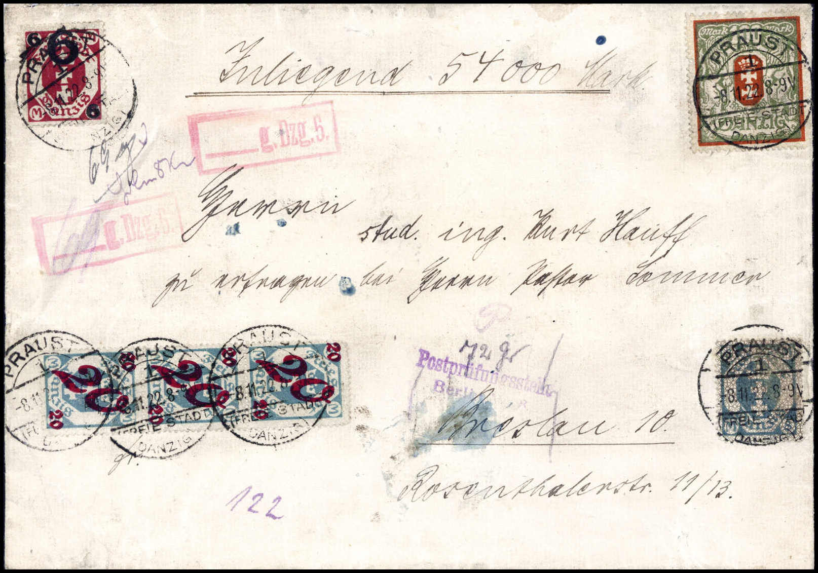 100 Mk. mit zufrankierten fünf Freimarken im Wert von 74 Mark auf Wertbrief über 54.000,- Mark (69 g) mit klaren Stempeln PRAUST 8/11 22 nach Breslau. Befördert über Berlin mit violettem L2 "Postprüfungsstelle Berlin". Trotz
