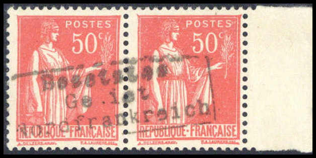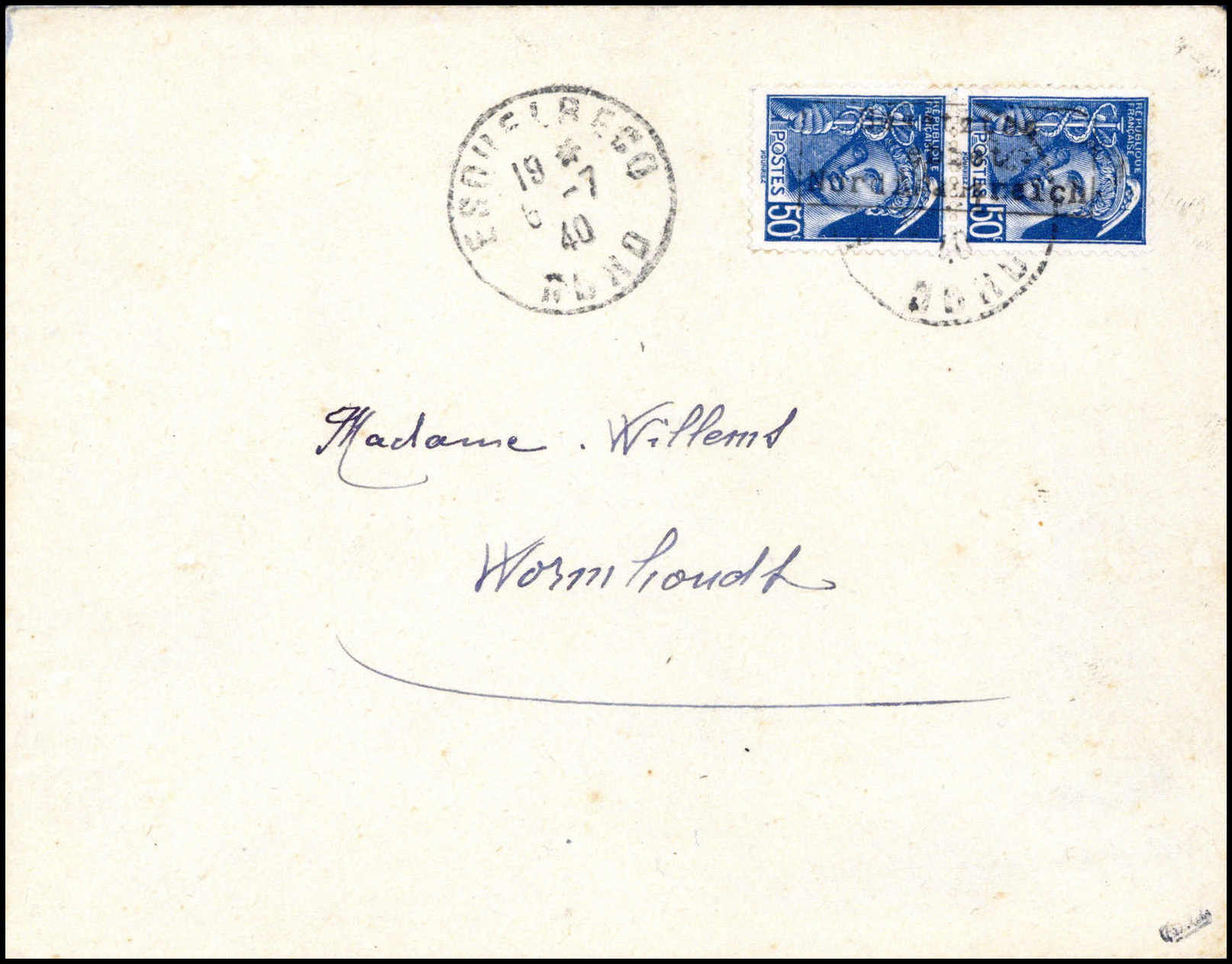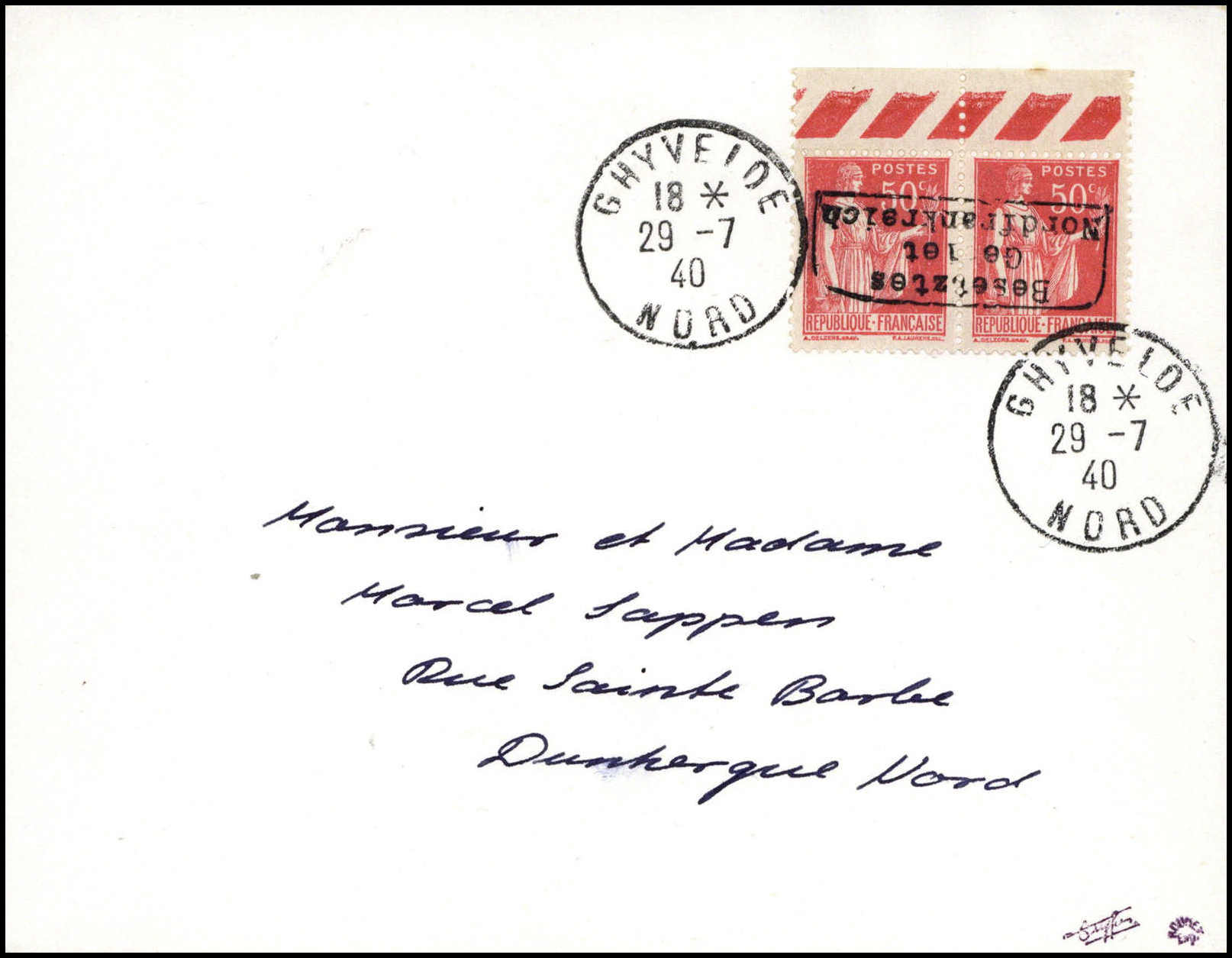 50 C., senkr. Paar auf Brief mit Stempel ESQUELBECQ 6/7 40 (winz. Beförd.-Spuren), sign. Calves, Fotoattest Herbst. Katalogpreis: 600,-