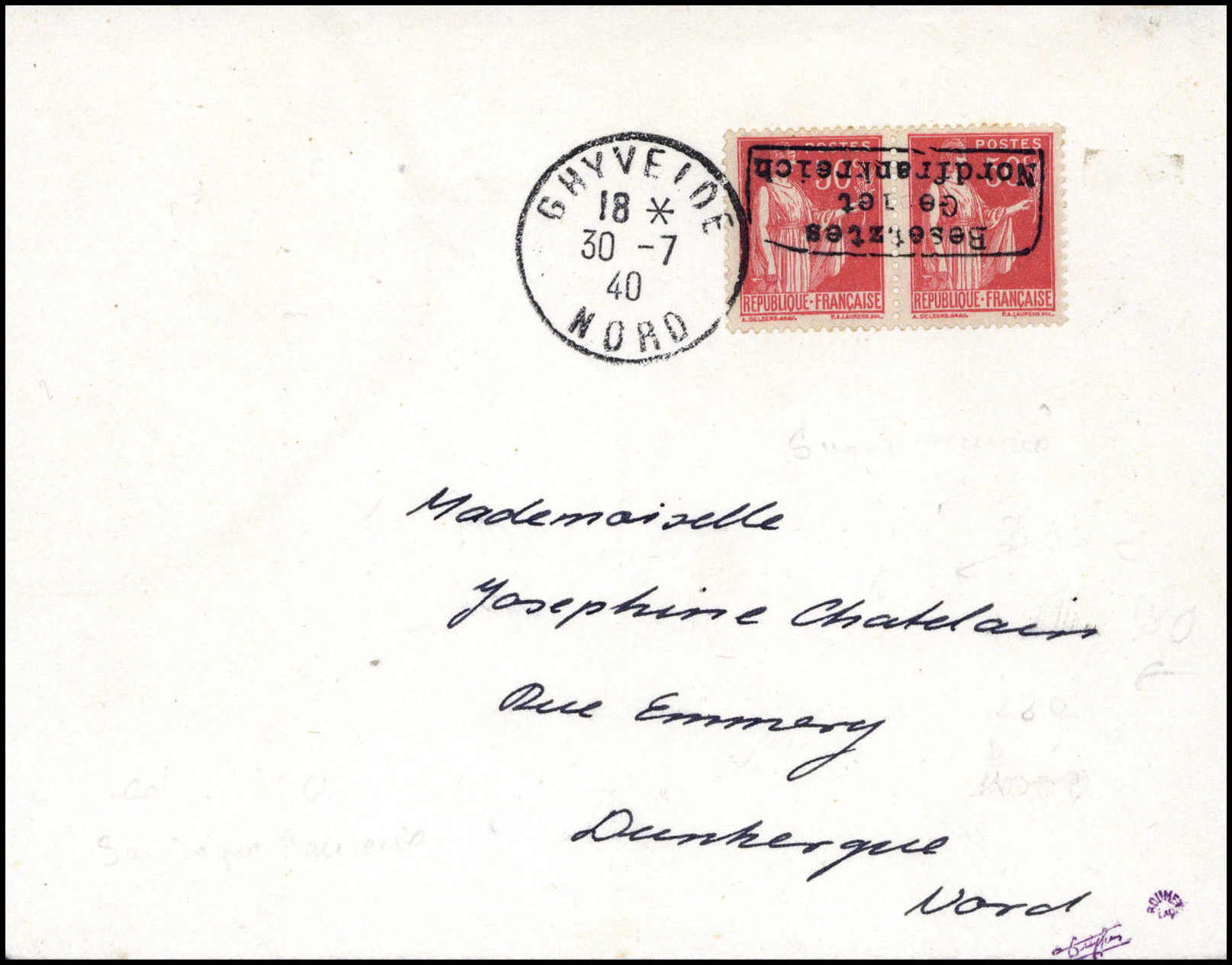 25 C., tadelloser Viererblock mit Abart: Aufdrucktype I senkrecht (statt waagerecht) auf tadellosem Brief mit Stempel DUNKERQUE 2/8 40 nach Malo mit Eingangsstempel. In dieser Form ein sehr seltener Brief von hohem Liebhaberwert,