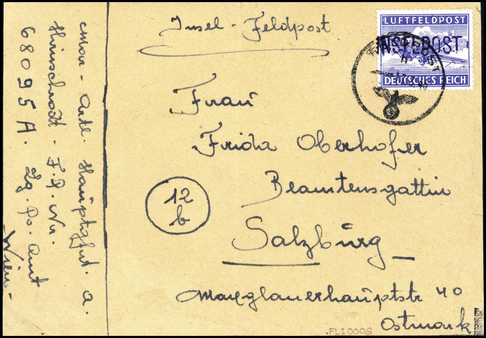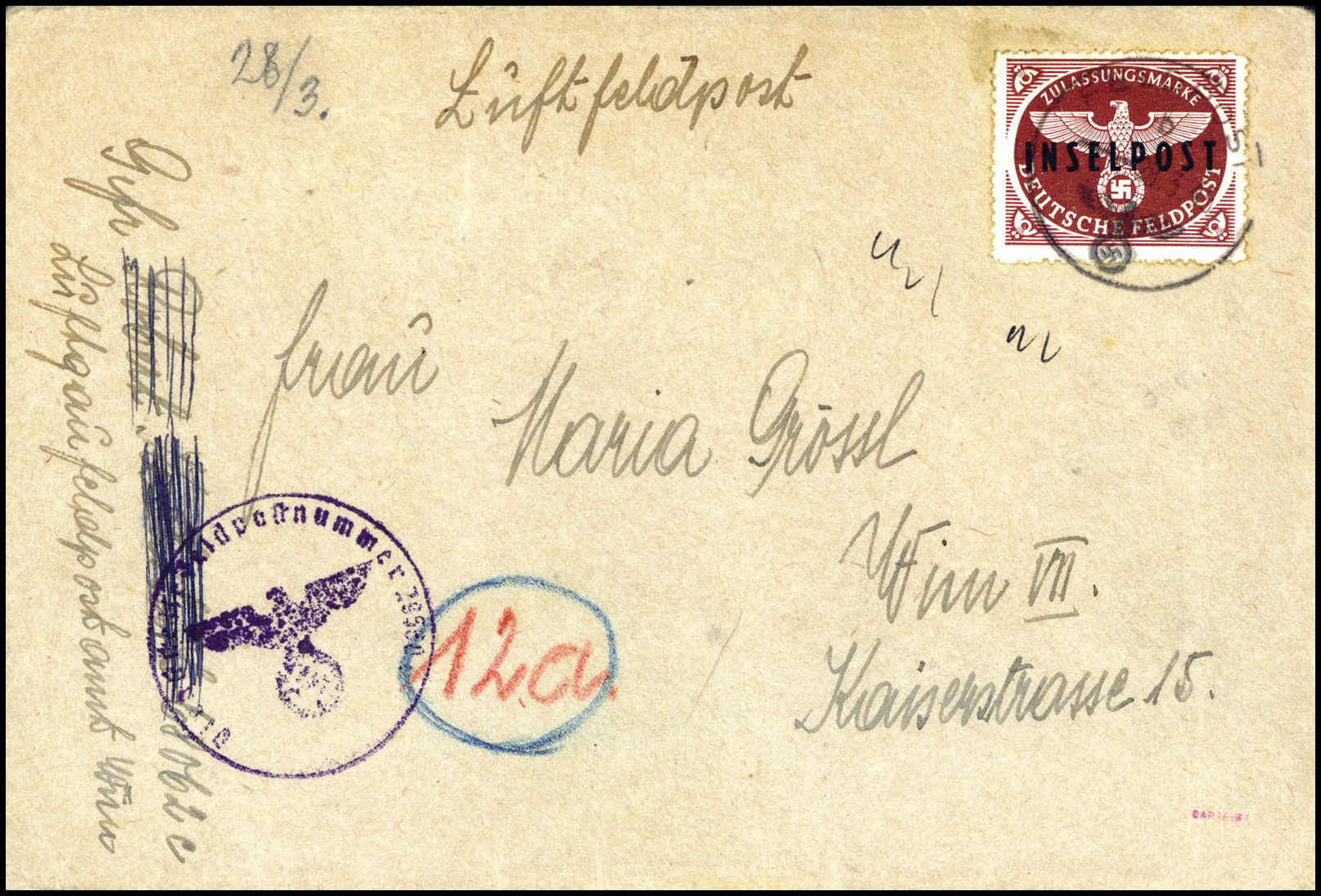 Insel Leros, gezähnt, tadelloses Exemplar mit Stempel des Zweig-Feldpostamts auf Leros vom 17.3.45 auf schönem Brief nach Salzburg, sign. Rungas, Fotoattest Müller BPP. Katalogpreis: 2.400,-