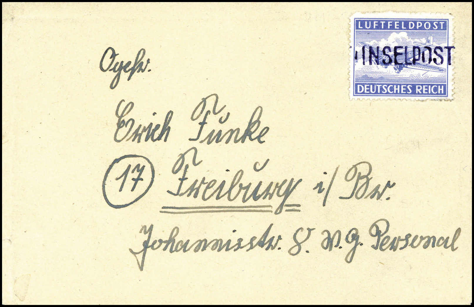 Bedarfsbriefe gezähnter Inselpost-Zulassungsmarken mit schwarzblauem Aufdruck sehr selten. Katalogpreis: 4.500,-