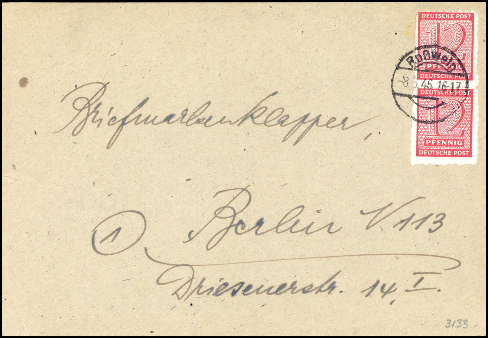 12 Pfg., PMT Roßwein, senkr. Paar als Mehrfachfrankatur auf Bedarfsbrief mit Stempel ROSSWEIN 8/3 46 nach Berlin, sign. Herbst BPP, Jasch BPP