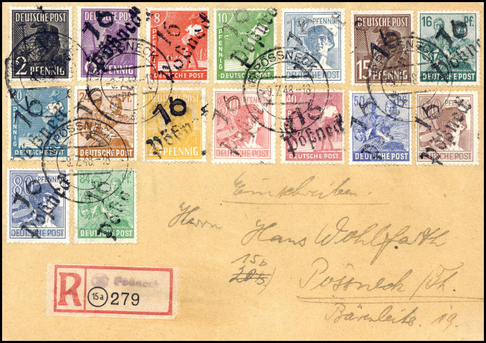 Bezirk "16 Pößneck" Arbeiter 2-84 Pfg., komplett auf R-Briefvorderseite, sign. Böheim BPP. Katalogpreis: 290,-