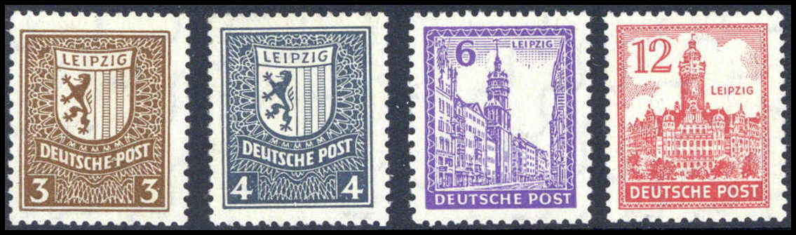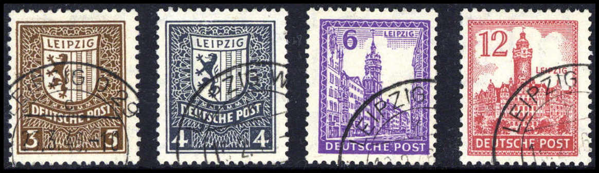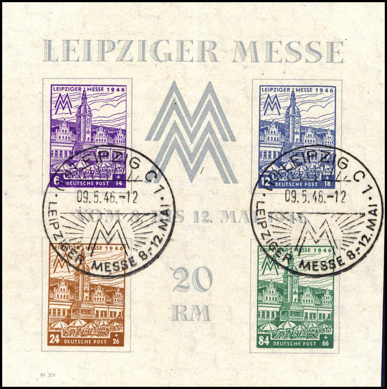 Versetzter Blockbogen-Verschnitt: Leipziger-Messe-Block, Wz. Y, senkr. stark verschnittenes Exemplar, wobei sich das Druckerzeichen links oben statt unten befindet, zwei sauber aufges. SST LEIPZIG 12/5 46. Eine außerordentlich seltene
