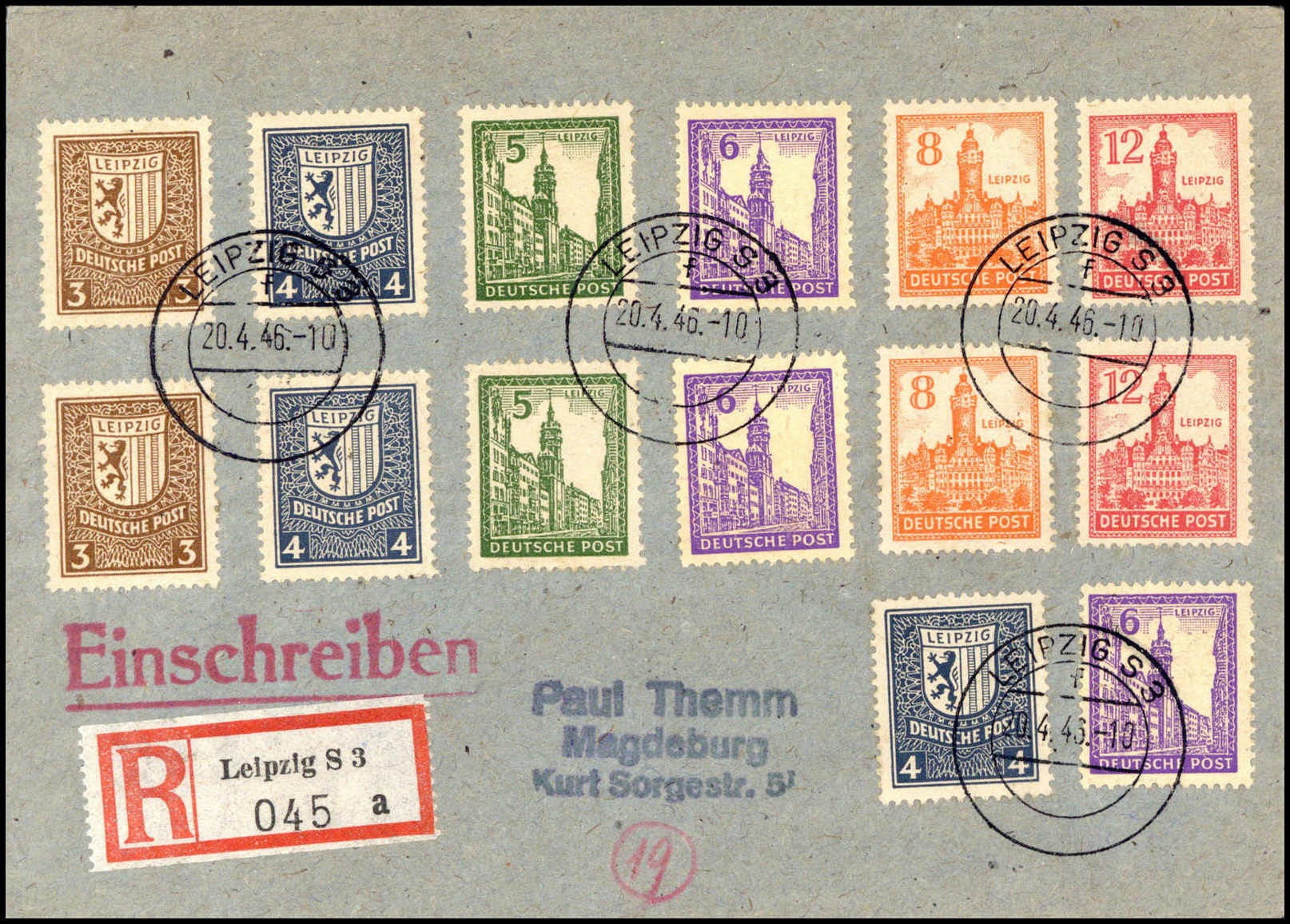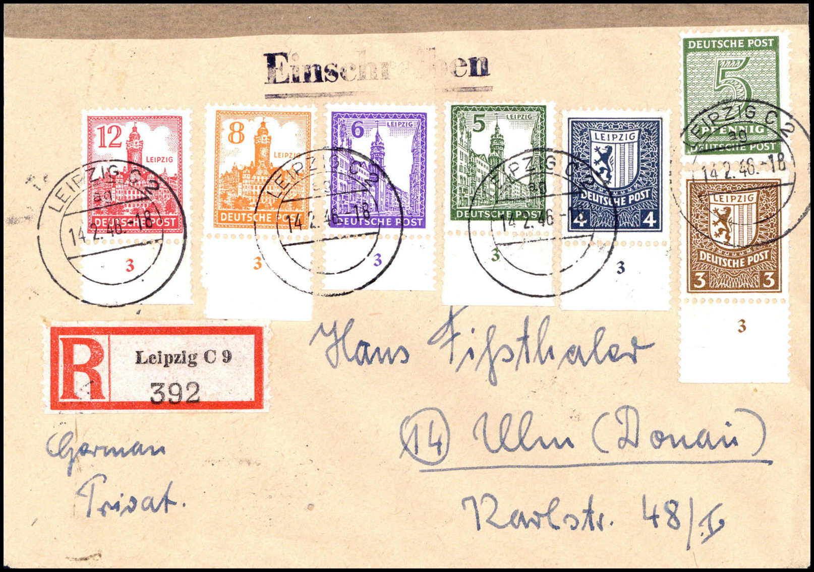 Abschied, sechs Werte, einheitlich vom Bogenunterrand mit Reihenzähler "3", zusammen mit Ziffern 5 Pfg auf R-Brief von Leipzig 14.2.46 nach Ulm