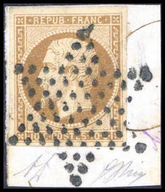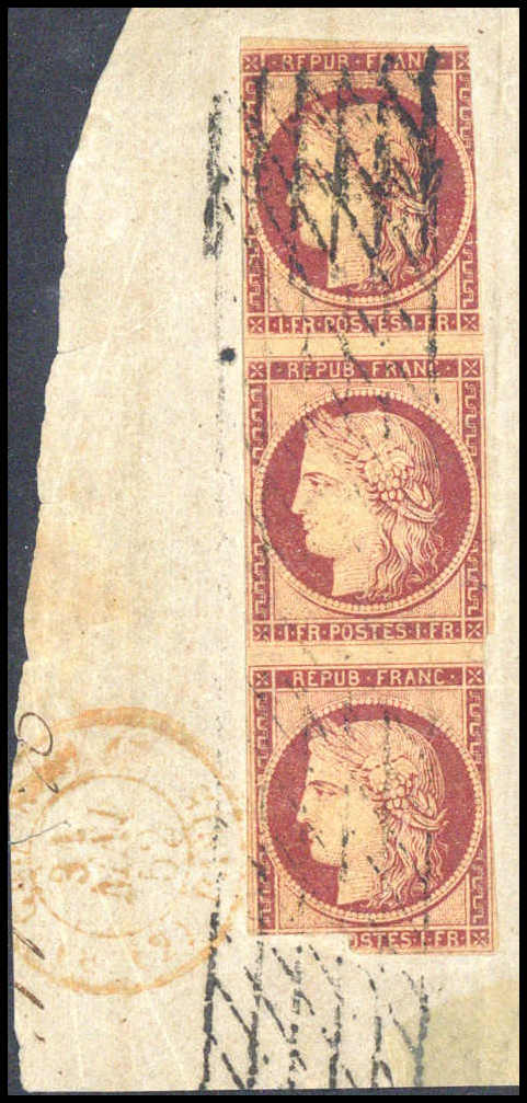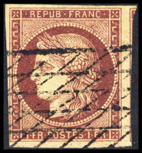 1 Fr. karmin, breitrandiges und frisch erhaltenes Luxusstück mit genau zentr. aufges. Sternstempel von Paris. Ausnahme-Exemplar für hohe Ansprüche, sign. Brun, Fotoattest v.d.Weid. Katalogpreis: 4.200,-