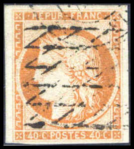 1 Fr. orangerot (vermillon vif), makellos frisches Luxusstück, ringsum voll- bis breitrandig geschnitten und mit ideal aufges. Rautenstempel. Eines der schönsten bekannten Exemplare dieser Europa-Rarität, Fotoattest Scheller. Katalogpreis: 20.000,-+