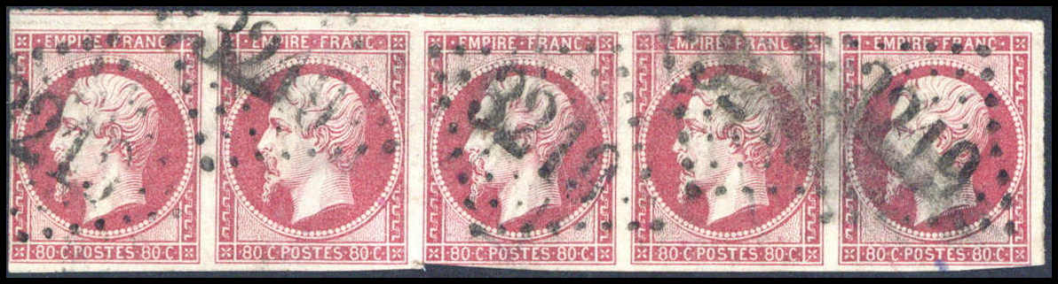 80 C., farbfrischer, waagr. Fünferstreifen (kl. Mängel) mit Stempel "3219"