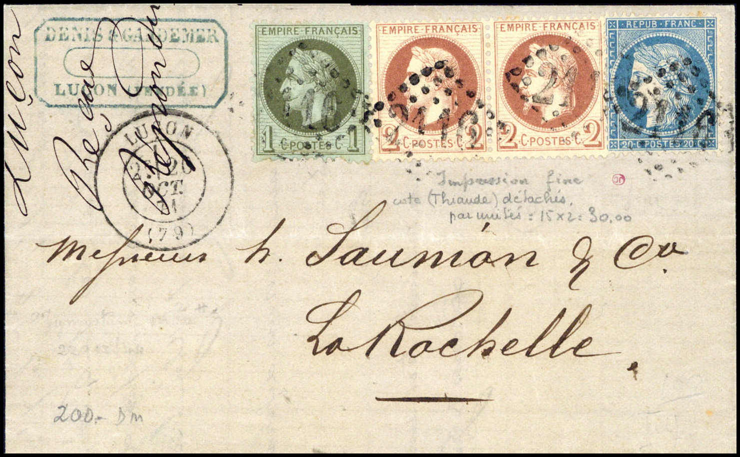 1 C. mit waagr. Paar 2 C. und Ausgabe 1870, 20 C. blau auf schönem Brief von Lucon nach La Rochelle