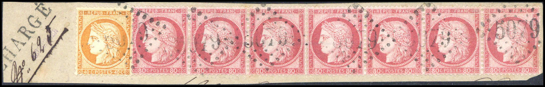 80 C., tadelloser, waagr. Siebenerstreifen zusammen mit 40 C. auf Bfstk. mit sauber aufges. Stempeln "5079" ALEXANDRET und beiges. L1 CHARGE