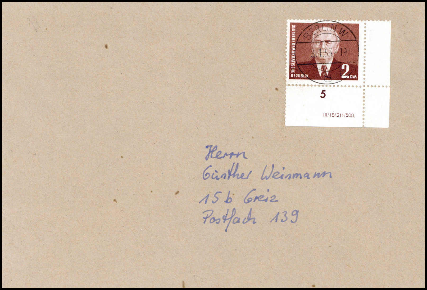 80 Pfg., gestrichenes Papier mit Lacküberzug sowie gleiche Ausgabe zweimal 2 Pfg. (ein Wert Eckfehler) auf portoger., oben min. verkürztem R-Brief mit klarem Stempel BERLIN-MAHLSDORF 1b 15/4 53, Fotobefund Paul BPP. Katalogpreis: