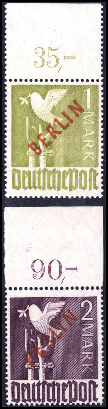 1 und 2 Mk., Plattendruck, tadellos postfrische Oberrandstücke, Fotoattest Schlegel BPP für die 2 Mk. Katalogpreis: 1.900,-