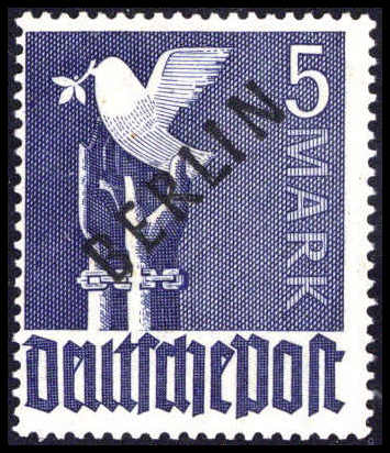 5 Mk., tadellose Einzelfrankatur mit sauber aufges. Luftbrückenstempel BERLIN SW 11 1/10 48 auf Luftbrücken-Firmenkuvert nach Koppenbrügge mit Ak.-Stempel. Eine sehr schöne, philatel. Einzelfrankatur des Schwarzaufdruck-Höchstwertes