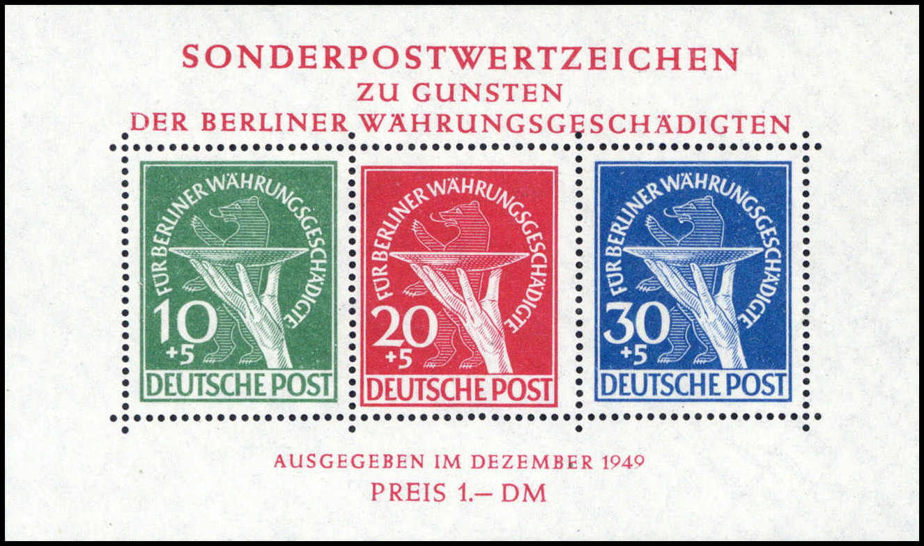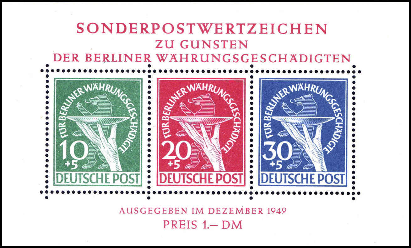 Währungsgeschädigten-Blocks mit roten Abstempelungen bekannt, Fotoattest Schlegel BPP. Katalogpreis: 2.200,-+