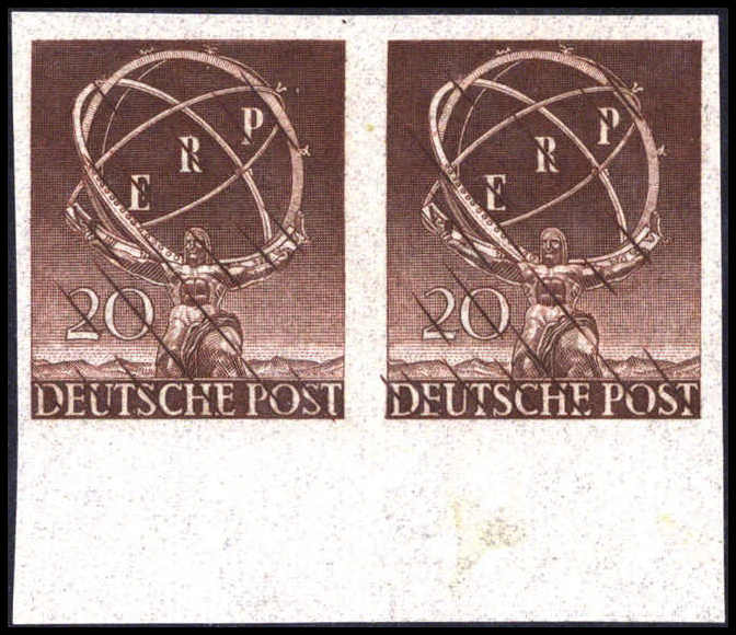 ERP, Probedruck in Schwarzgelbbraun, ungezähnt, tadellos postfrisches waagr. Unterrandpaar. Einheiten dieses Probedrucks sind äußerst selten, sign. Schlegel BPP. Katalogpreis: 2.000,-