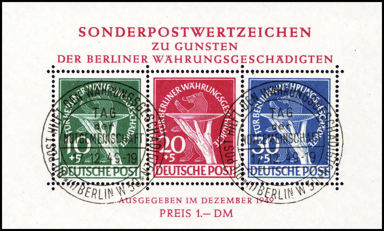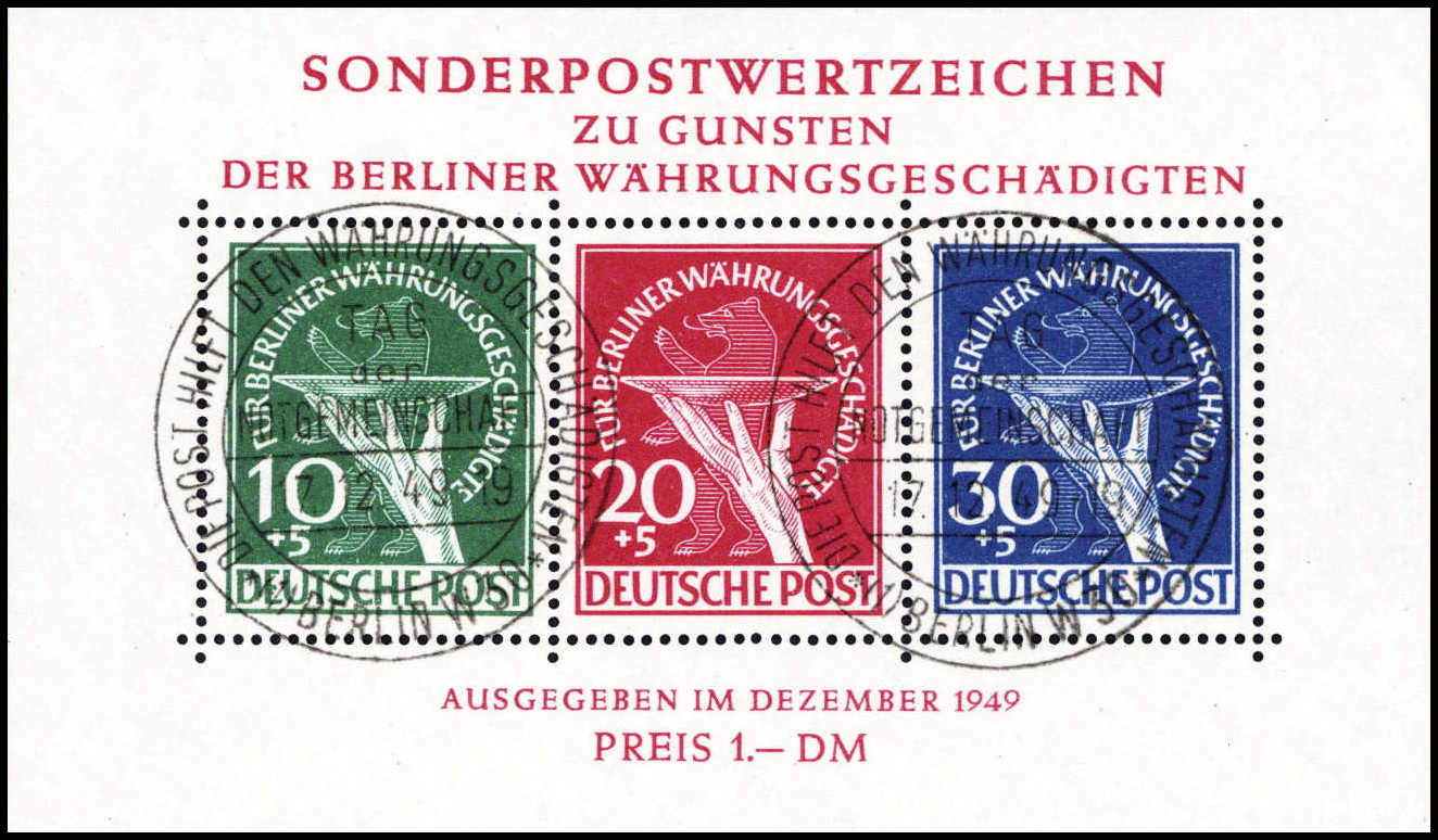 Währungsgeschädigten-Block, tadelloses Exemplar mit zwei ideal aufges. Ersttags-SST, Fotoattest Schlegel BPP. Katalogpreis: 2.200,-+