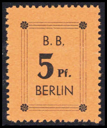 (1950), "Briefbeförderung Berlin" 5 Pfg. schwarz/orange. Marke der geplanten Privatpost-Anstalt, welche sich den starken Kursunterschied zwischen der West- und der Ost-Währung Berlins zu Nutze machen wollte, um Post aus dem Westen im