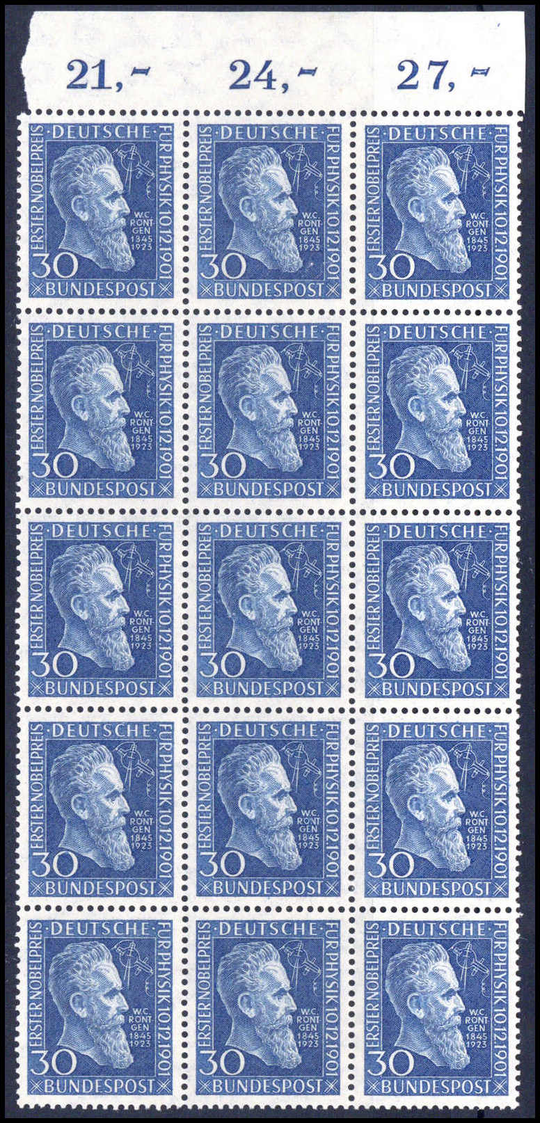 Röntgen, tadellos postfrischer senkr. 15er-Block vom Oberrand. Katalogpreis: 1.275,-