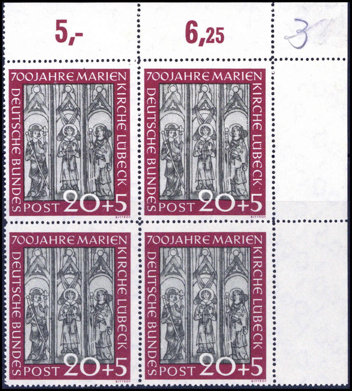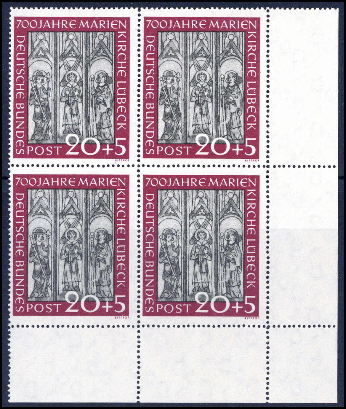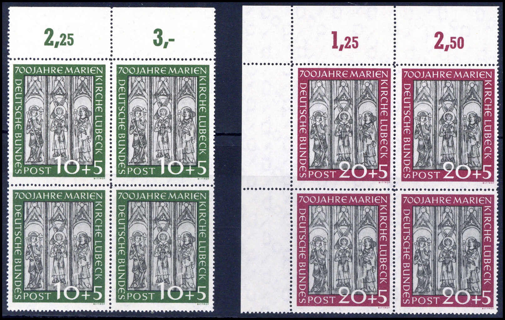 Marienkirche, tadellos postfrische Viererblockserie vom Oberrand bzw. 20 Pfg. aus der li. ob. Bogenecke. Katalogpreis: 880,-+
