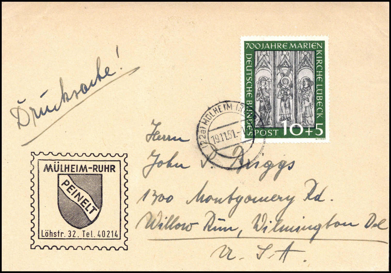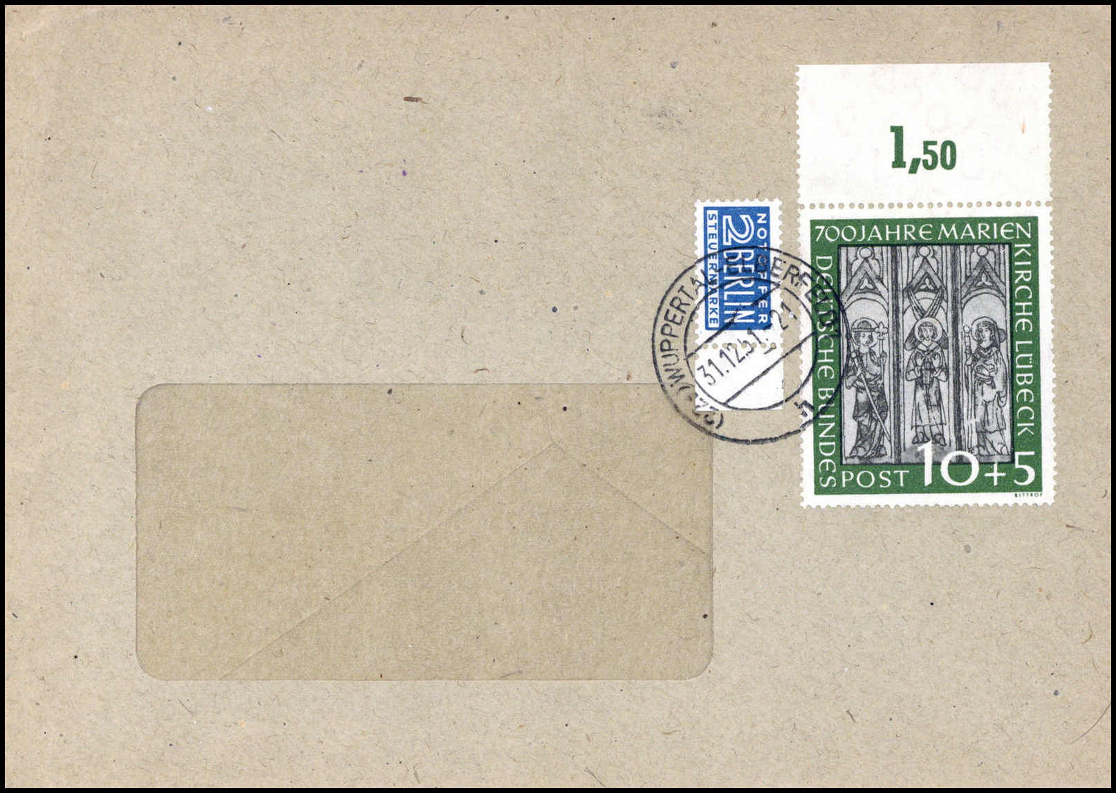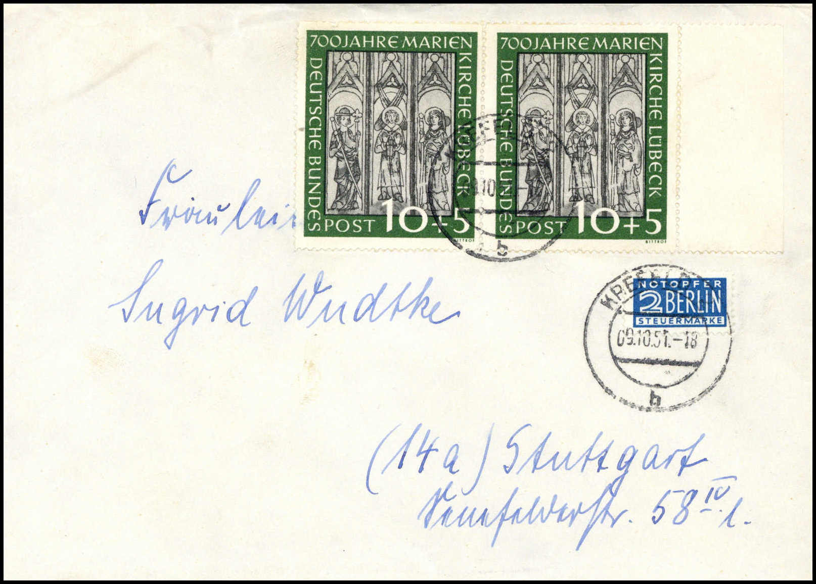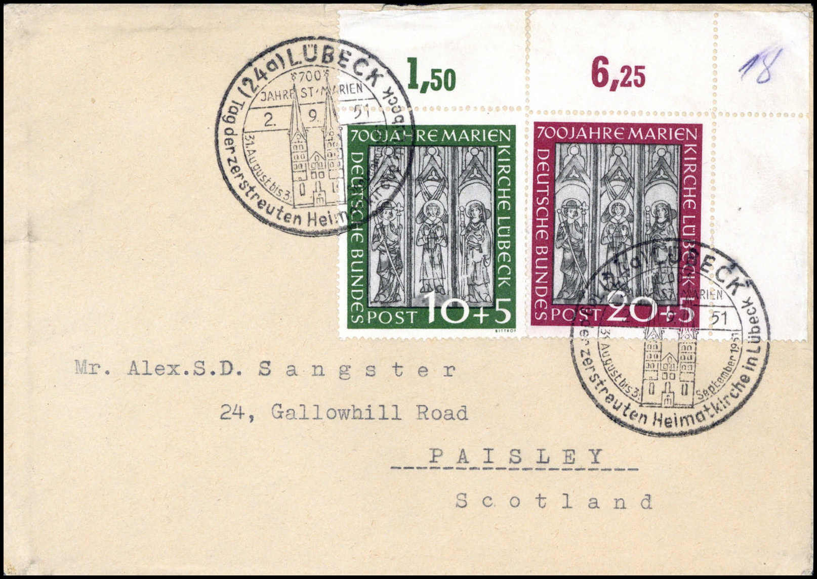 Marienkirche, 10 Pfg. vom Oberrand, 20 Pfg. re. obere Bogenecke auf nach Schottland adressiertem Brief (Beförd.-Spuren) mit SST LÜBECK 2/9 51