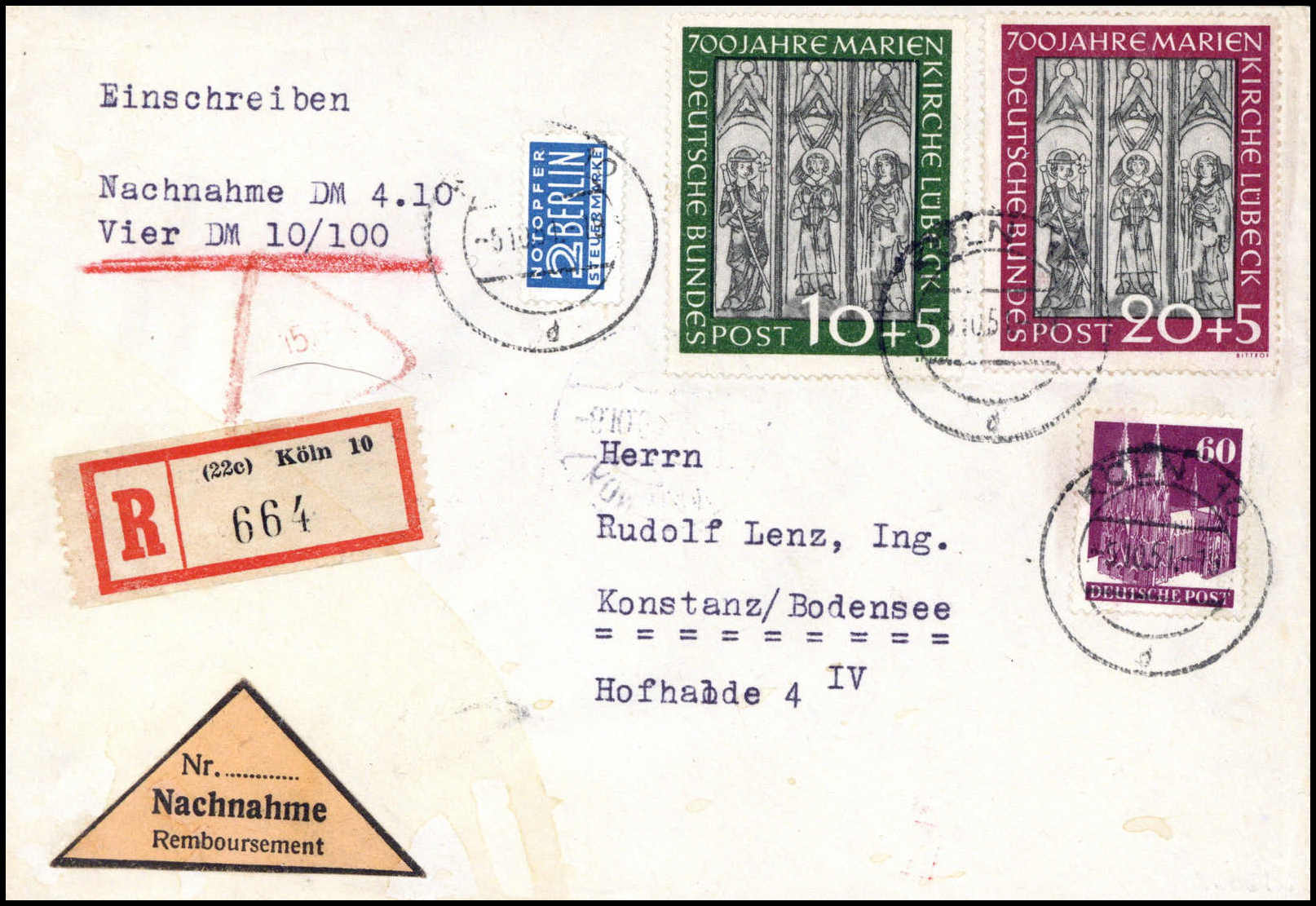 Marienkirche mit Bauten 60 Pfg. auf Einschreibe-Nachnahmebrief von Köln nach Konstanz