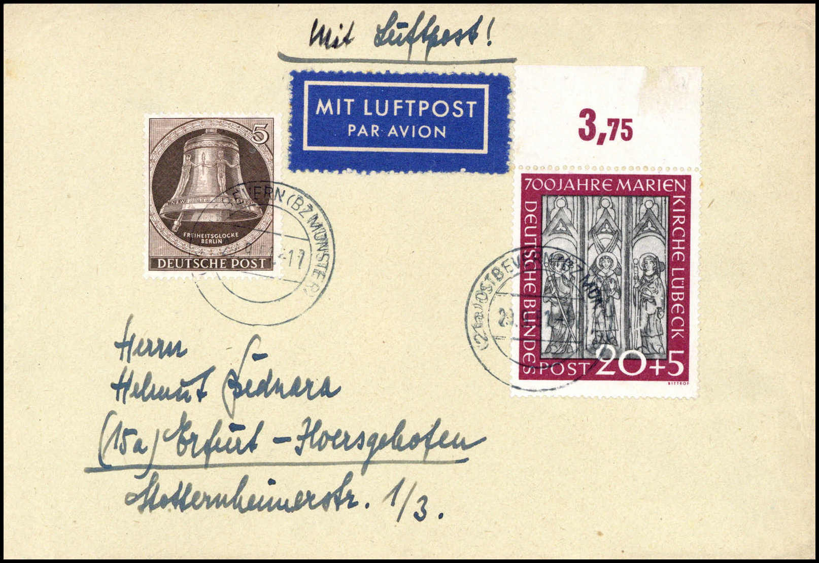 20 Pfg., Oberrandstück mit Berlin Glocke li. 5 Pfg. auf Luftpostbrief von Bevern nach Erfurt