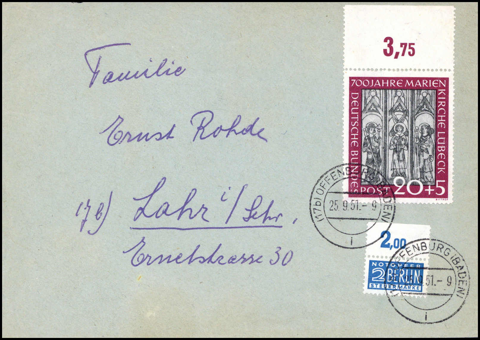 20 Pfg., tadelloses Oberrandstück mit Notopfer auf schönem Brief von Offenburg nach Lahr