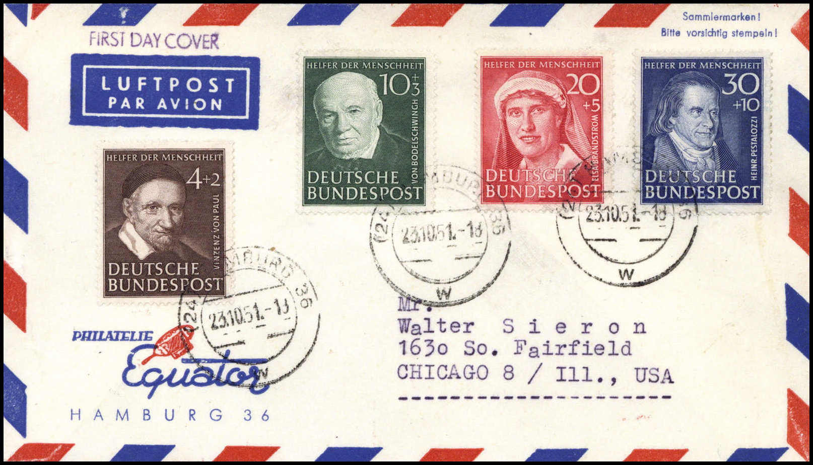 Wohlfahrt 1951, tadelloser Luftpost-Ersttagsbrief mit Stempeln HAMBURG 23/10 51 (30 Pfg. kaum merkliche Faltspur, Fotoattest Schlegel BPP. Katalogpreis: 1.400,-