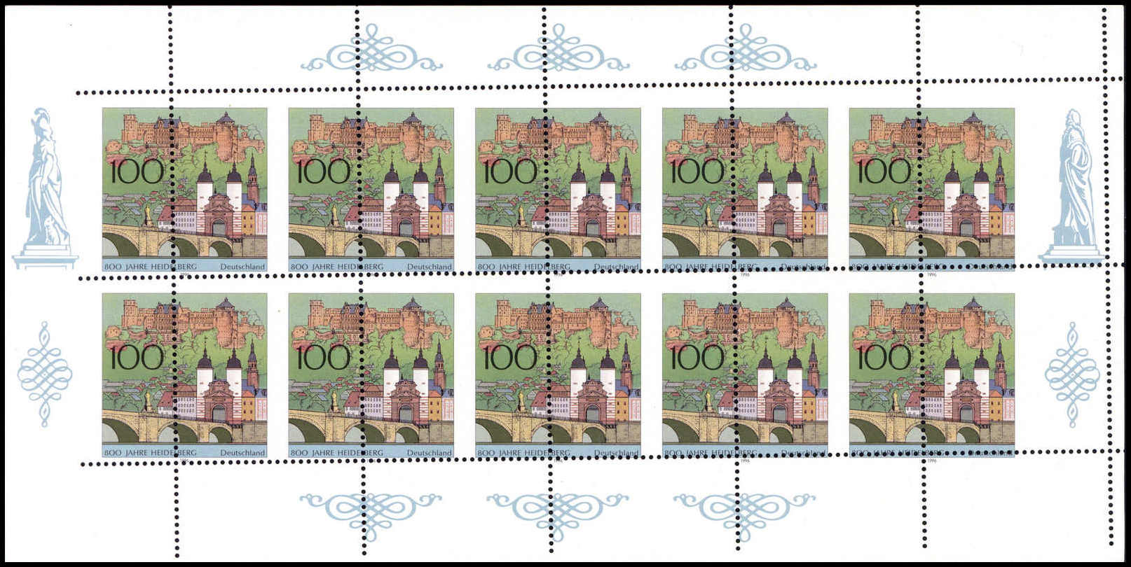 800 Jahre Heidelberg, verzähnter Zehnerbogen, die Zähnung um ca. 20 mm nach rechts und 3-4 mm nach oben verschoben, postfrisch (etwas bügig)