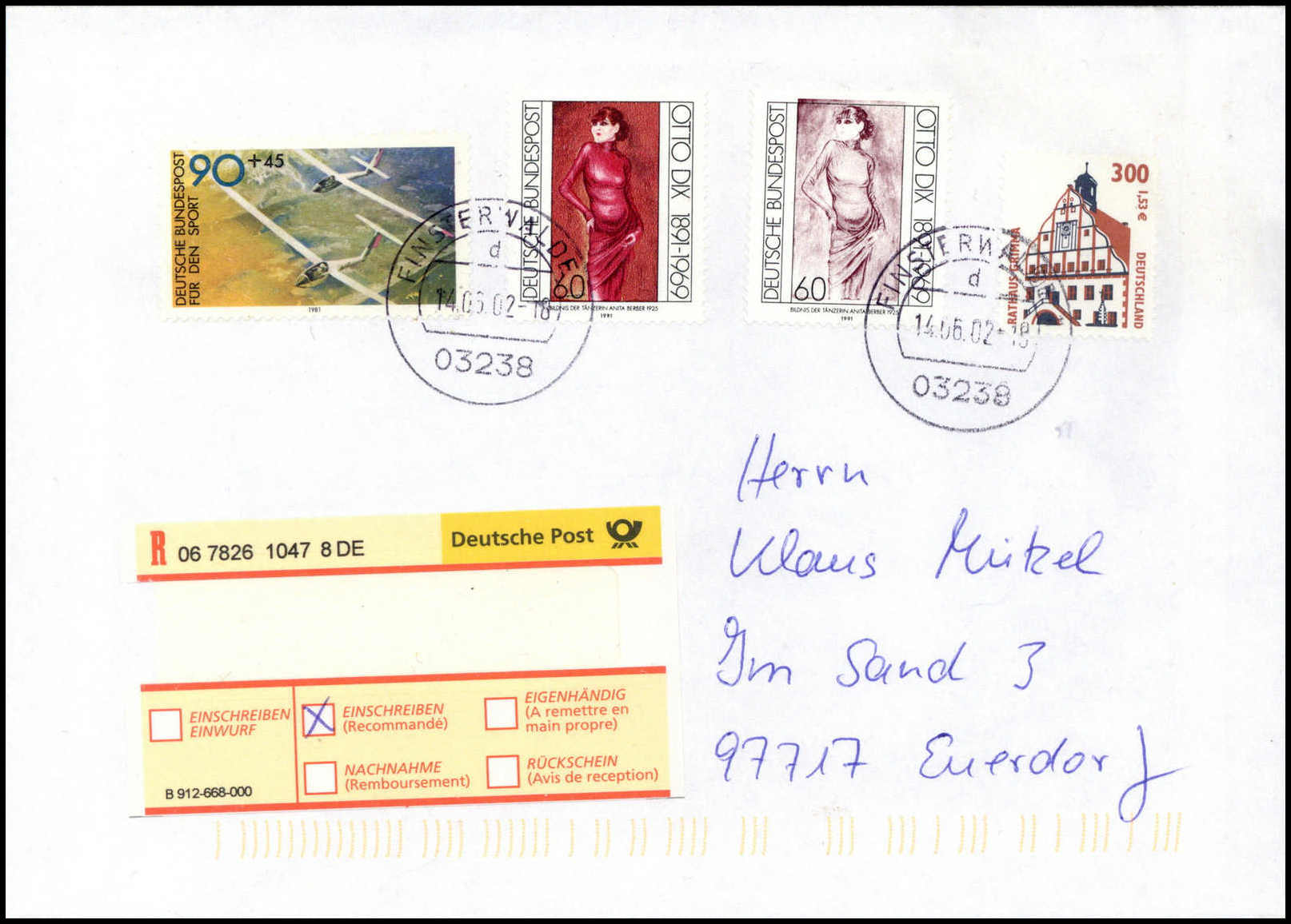 Dix 60 Pfg., zwei Werte, davon einer mit Fehldruck "Farbe lebhaftmagenta fehlend" und weiterer Zusatzfrankatur auf R-Brief mit Stempel FINSTERWALDE 14/5 02, Fotoattest Schlegel BPP