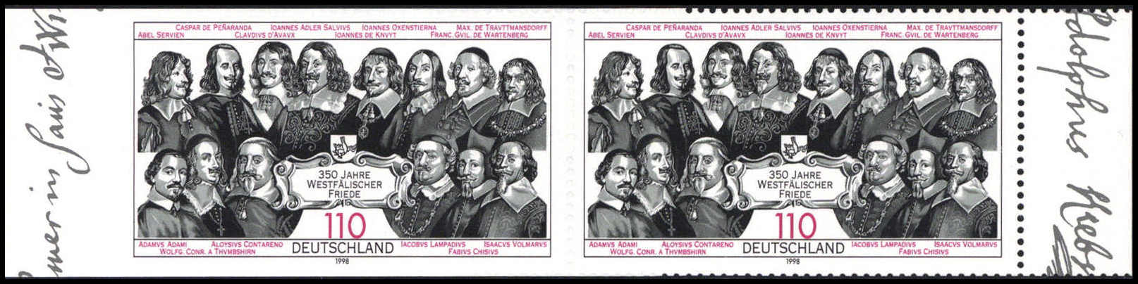 Westfälischer Friede, waagr. Paar mit Abart: li. Marke vierseitig, re. Marke li. ungezähnt aufgrund zu geringen Anpressdrucks der Perforationsnadeln, tadellos postfrisch, Fotoattest Schlegel BPP. Katalogpreis: 400,-+
