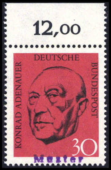 Roter Adenauer: 30 Pfg. lebhaftrot/schwarz, tadellos postfrisches Exemplar mit oberem Bogenrand, unten violetter Handstempel-Aufdruck "Muster". Vorzugliches Exemplar dieser BRD-Rarität, welche zur Ausgabe vorgesehen war, dann jedoch durch