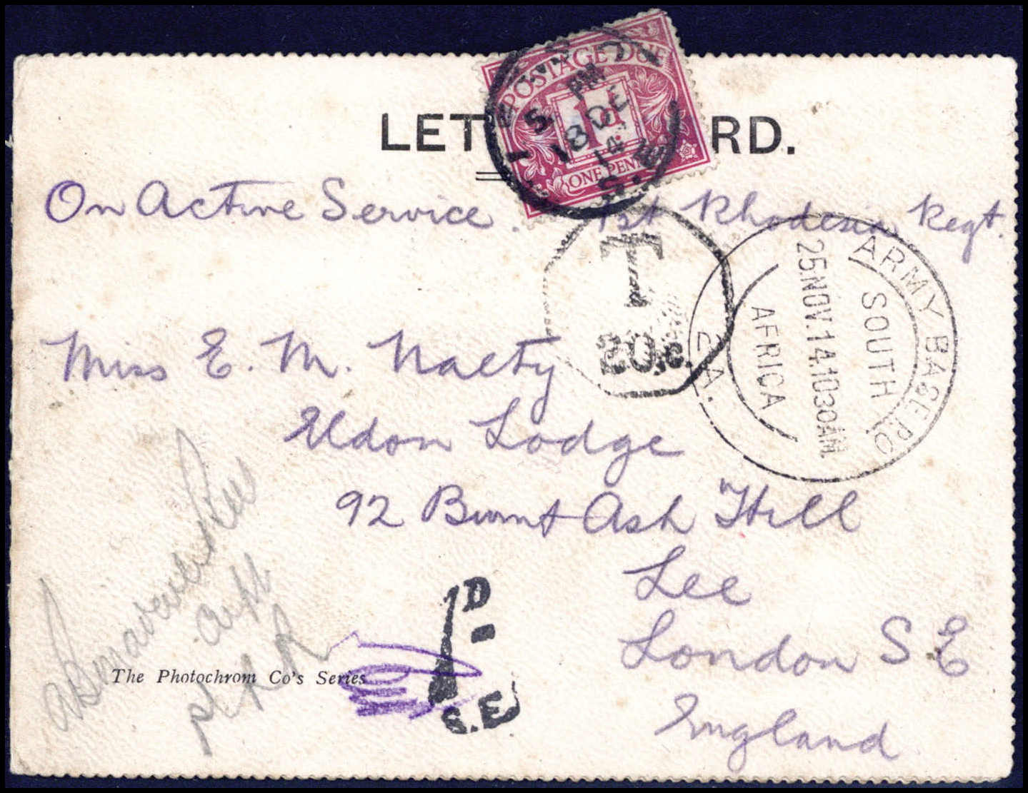 Letter Card "On Active Service" von Angehörigem des 1st Rhodesia Regt. mit K2 "ARMY BASE P.O. 2A", 25/11/14 (im OFS) nach England, dort austaxiert mit Nachporto 1 d. (über Rand geklebt). Post von Rhodesischen Truppen ist selten