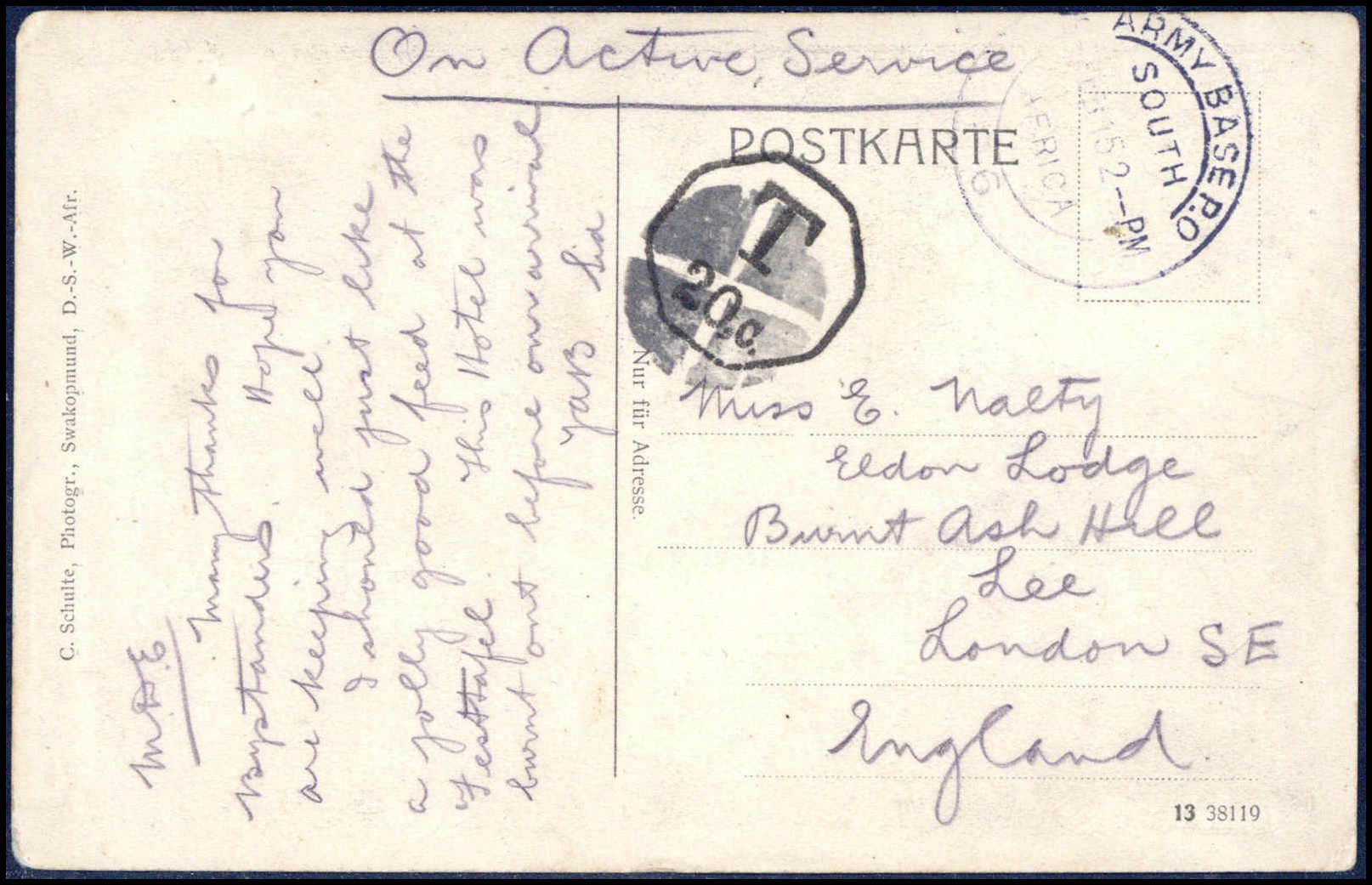Ansichtskarte "Hotel Kaiserhof Swakopmund" mit K2 "ARMY BASE P.O. 6", ?/2/15 mit gestrichener Taxierung nach London. Aus dem Text: "This Hotel was burnt out before our arrival"