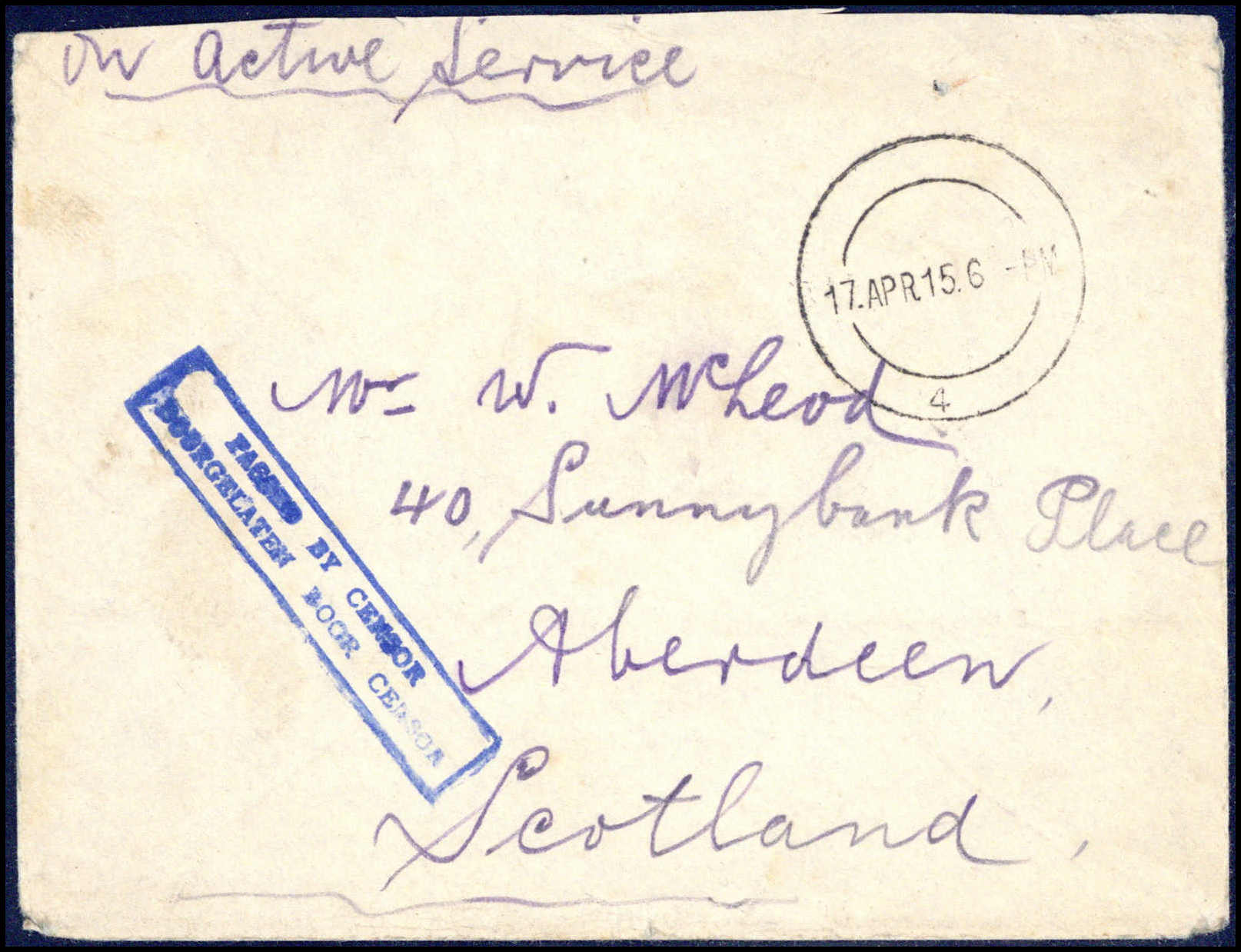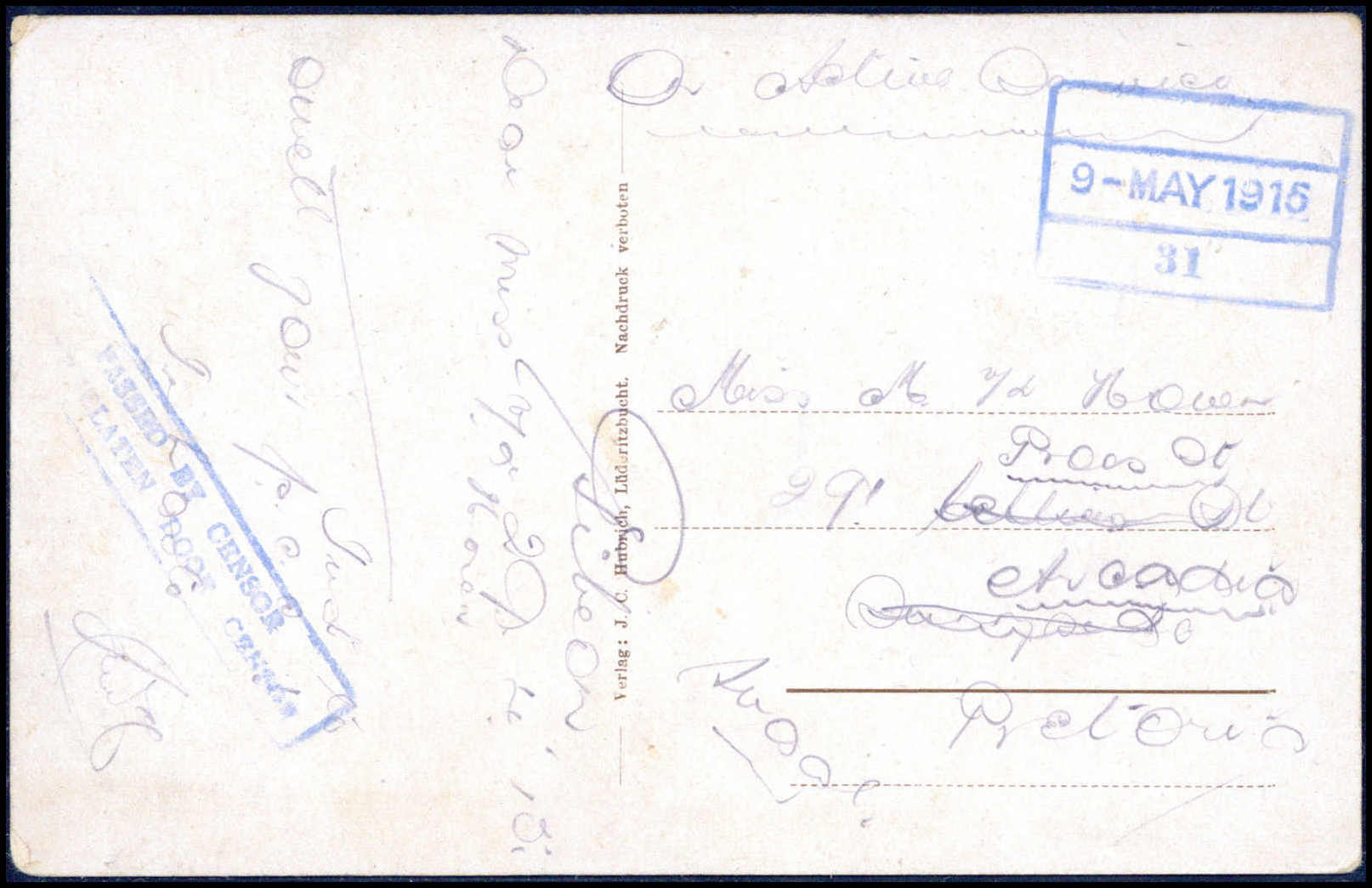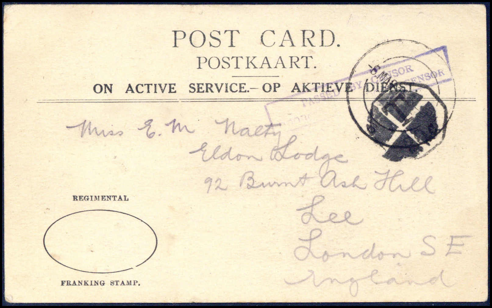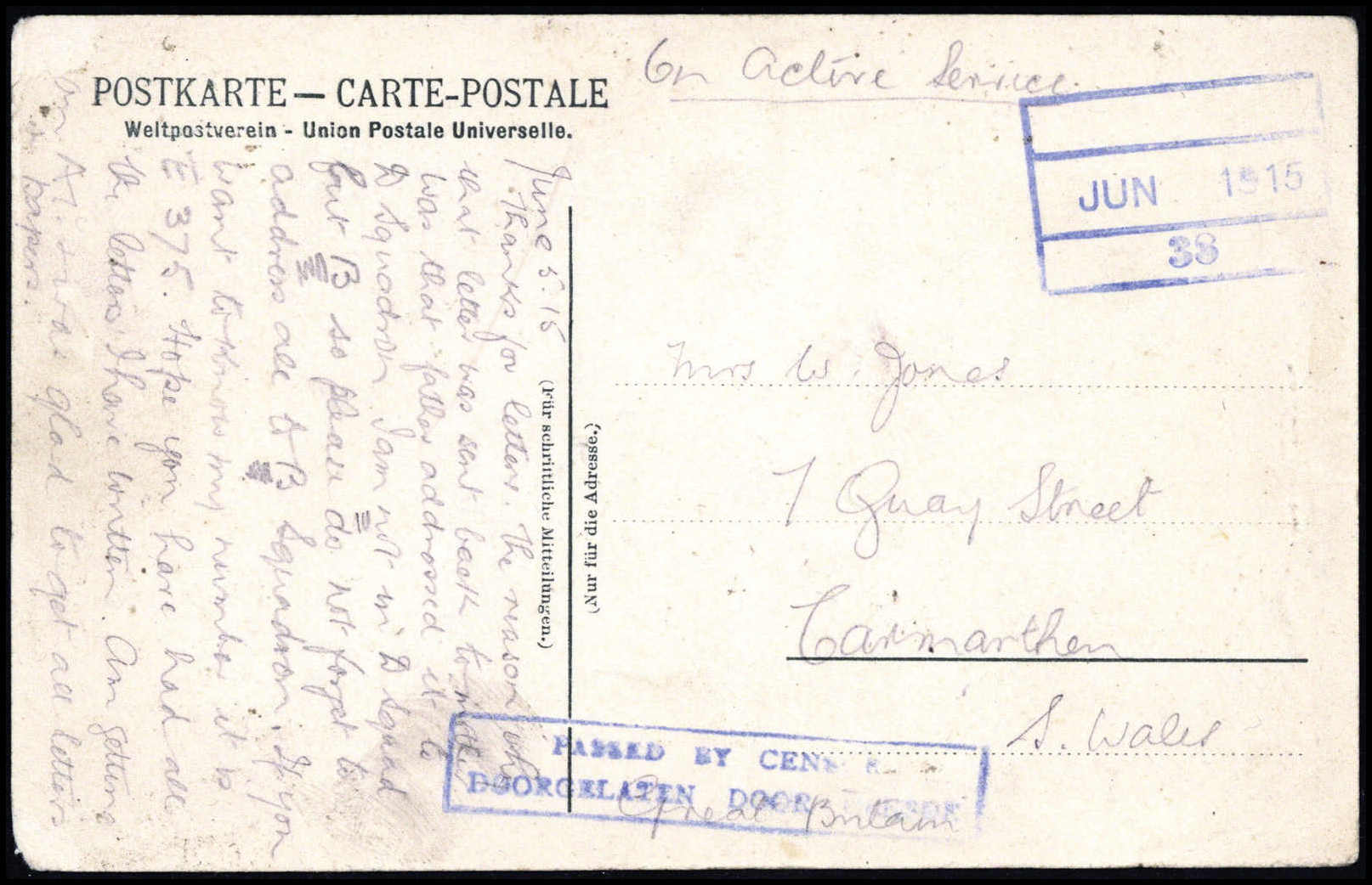 Mariental, violetter Gummikastenstempel "38", 6/1915 auf zensierter "On Active Serice" Ansichtskarte datiert 5/6 nach Wales. Provenance: White Lady I
