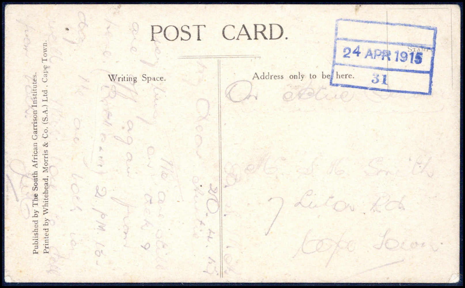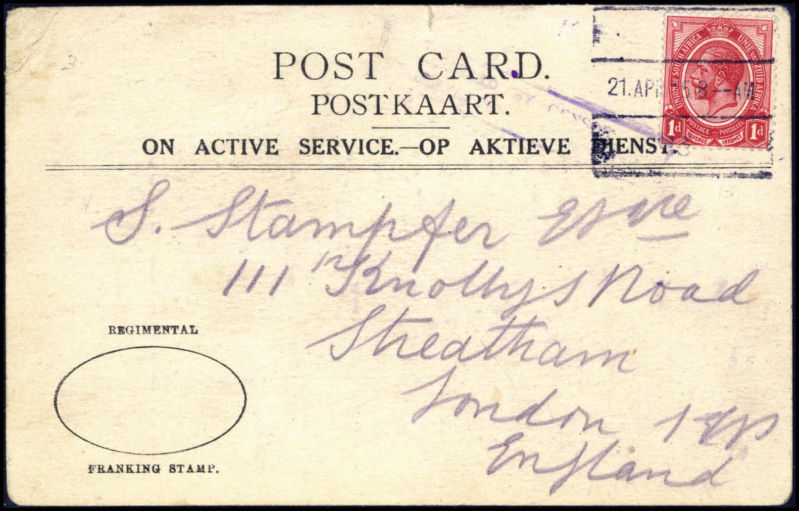 Swakopmund, Kastenstempel "13", 21/4/15 deutlich zentrisch auf 1d. auf "ON ACTIVE SERVICE" Postkarte von Angehörigem der Northern Force nach London