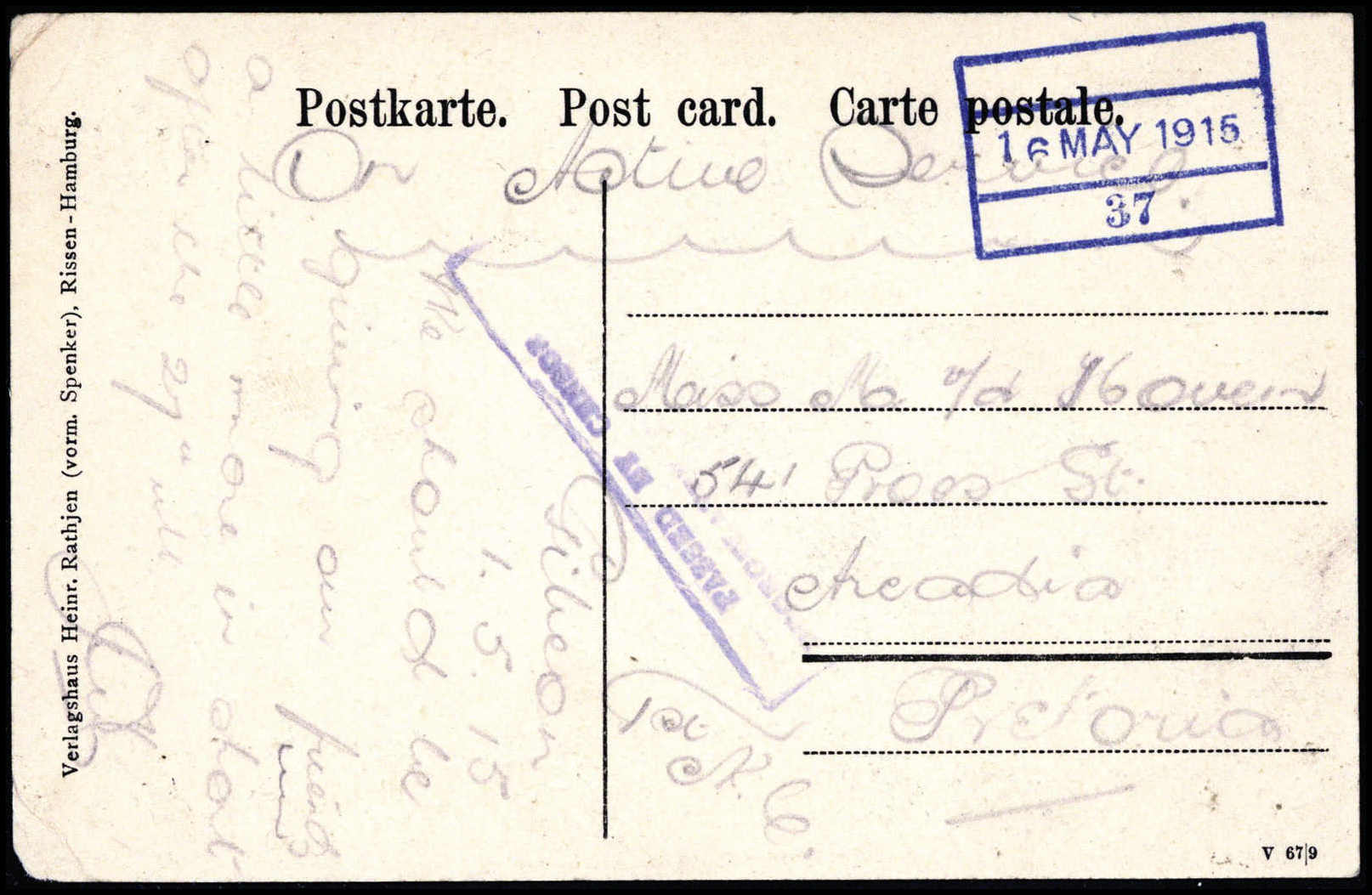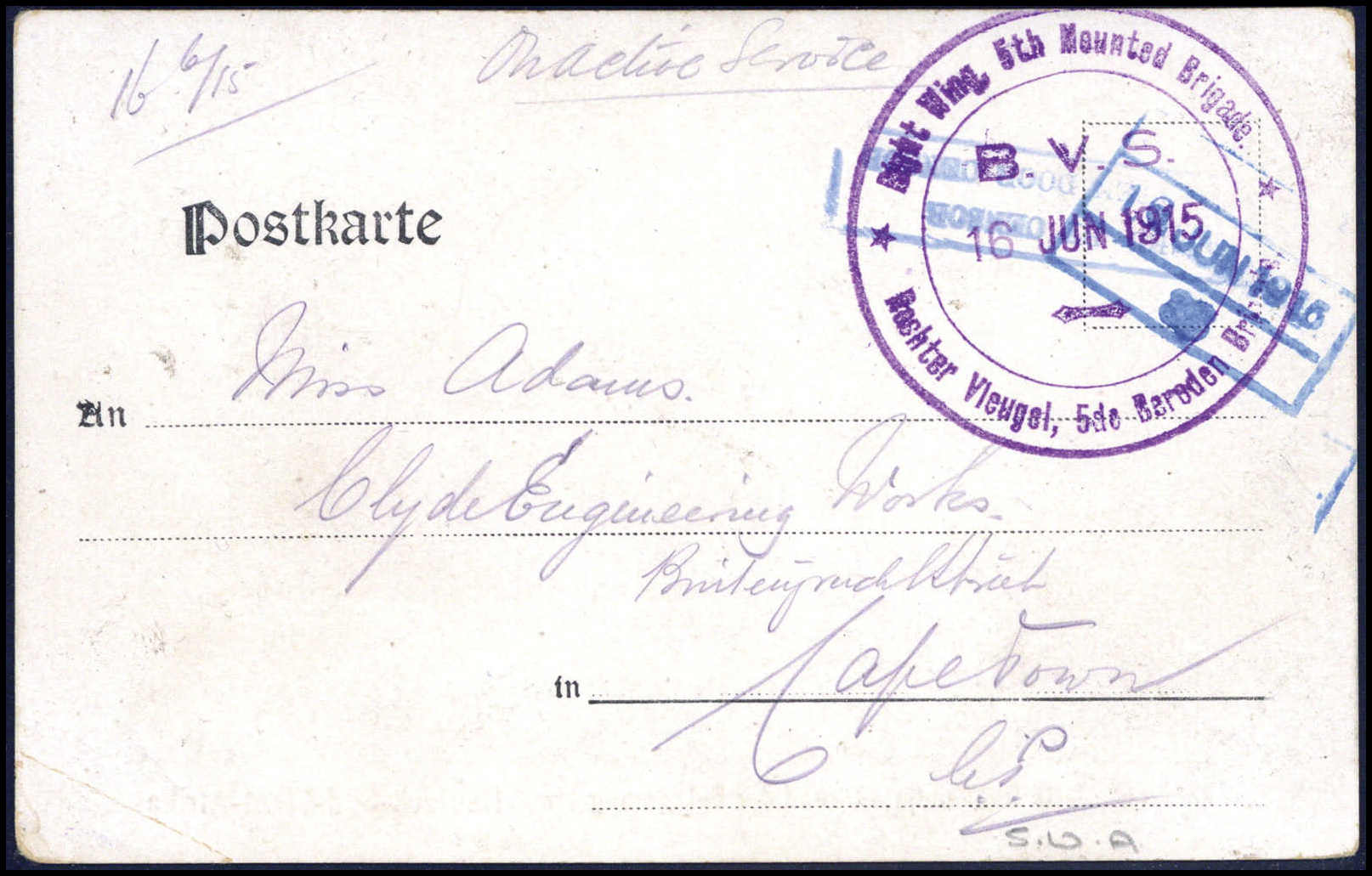 Johann Albrechtshöhe, blauer Gummikastenstempel "33", 16/6/15 auf Ansichtskarte mit violettem K2 "Right Wing 5th Mounted Brigade B.V.S.", zensiert nach Cape Town
