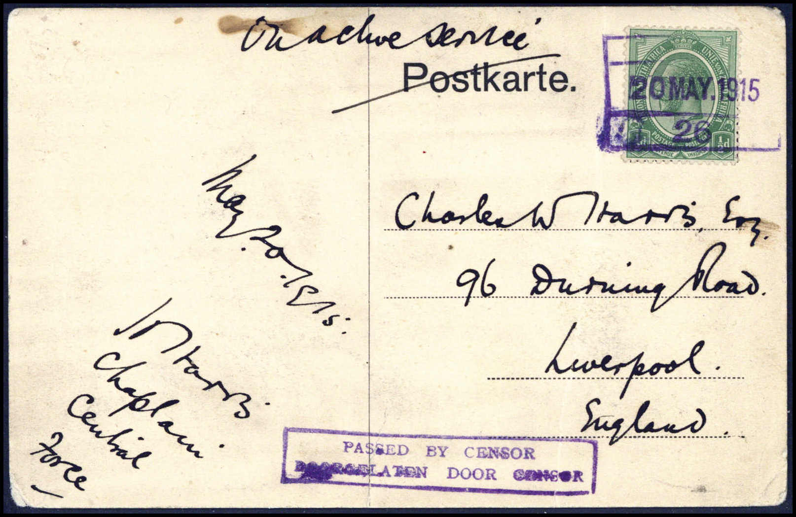 (GIBEON), violetter Gummikastenstempel "26" 20/5/15 auf Ansichtskarte 1/2 d. "on Active Service" von einem Angehörigem der Central Force nach Liverpool. Seltene, bei Putzel abgebildete Karte
