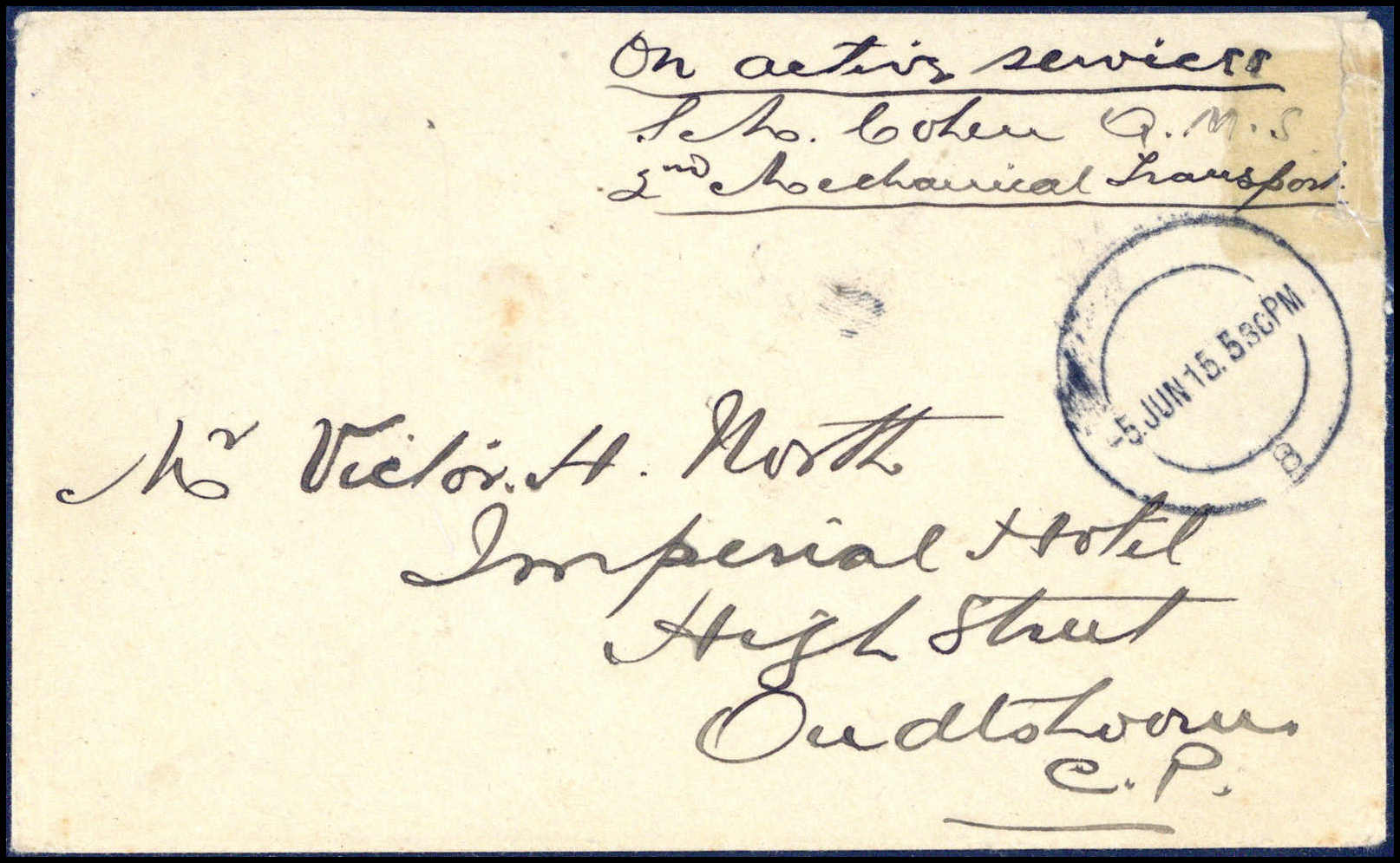 Keetmanshoop, Skelettstempel "8", 5/6/15 oben rechts auf "On active Service"-Umschlag (rechts kleine defekte Stelle von Klebeband glasig) mit Zensurzettel "OPENED BY FIELD CENSOR." rückseitig nach Oudtshoorn. Seltener Stempel