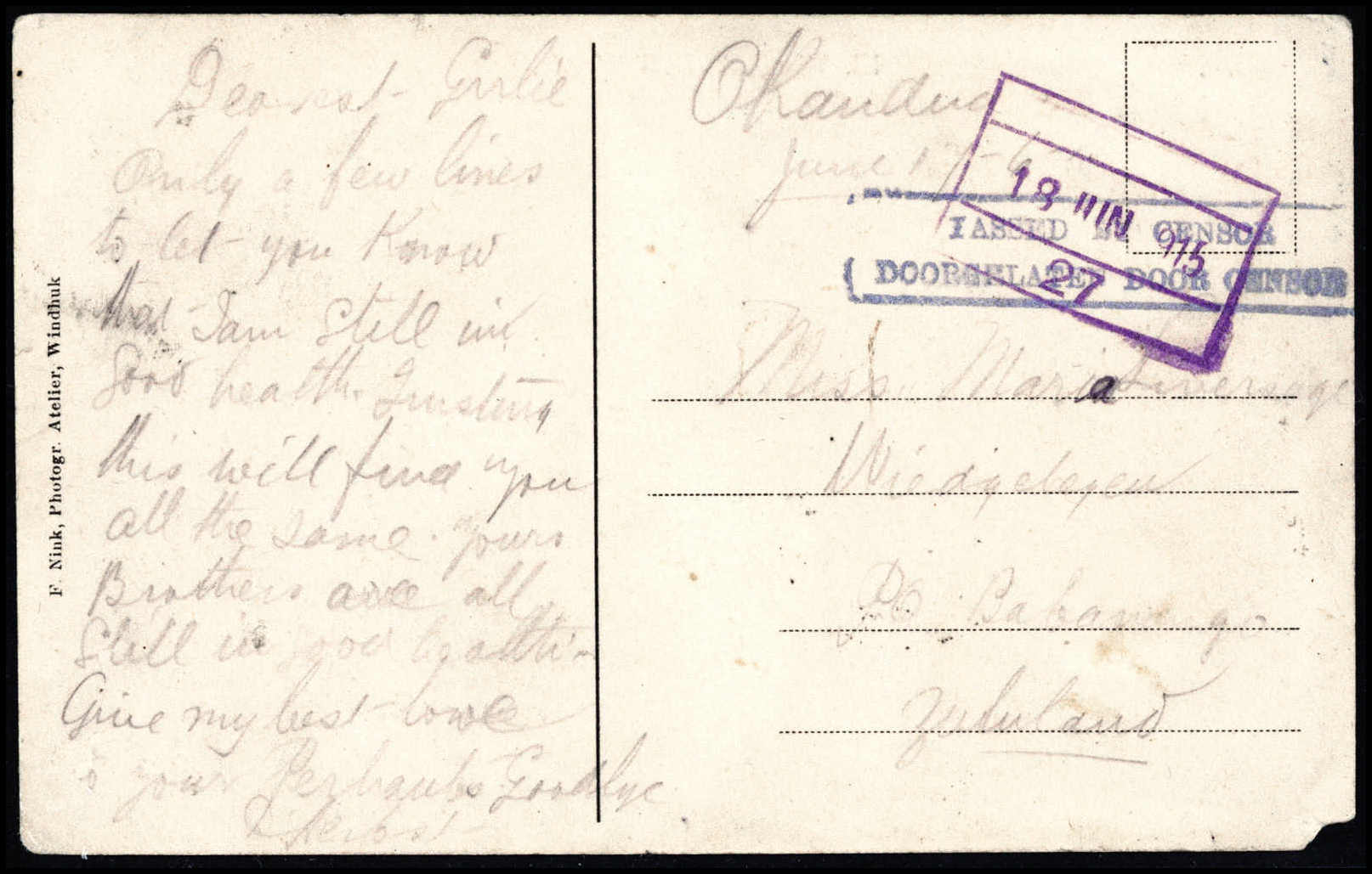 Wilhelmstal, violetter Gummikastenstempel "27", 18/6/15 auf zensierter Ansichtskarte (Ecke unten rechts wenig kürzer) aus Okandua 17/6 nach Babanago (Zululand)