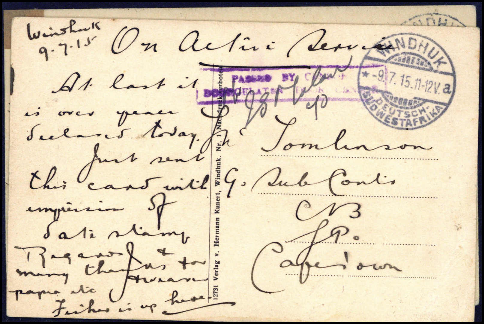 WINDHUK DSWA 9/7/15, Brückenstempel unverändert mit deutscher Inschrift auf zensierter Ansichtskarte "On Active Service" nach Cape Town. Aus dem Text: "this card with impression of date stamp". Dazu Postkarte mit gleichem Stempel aus
