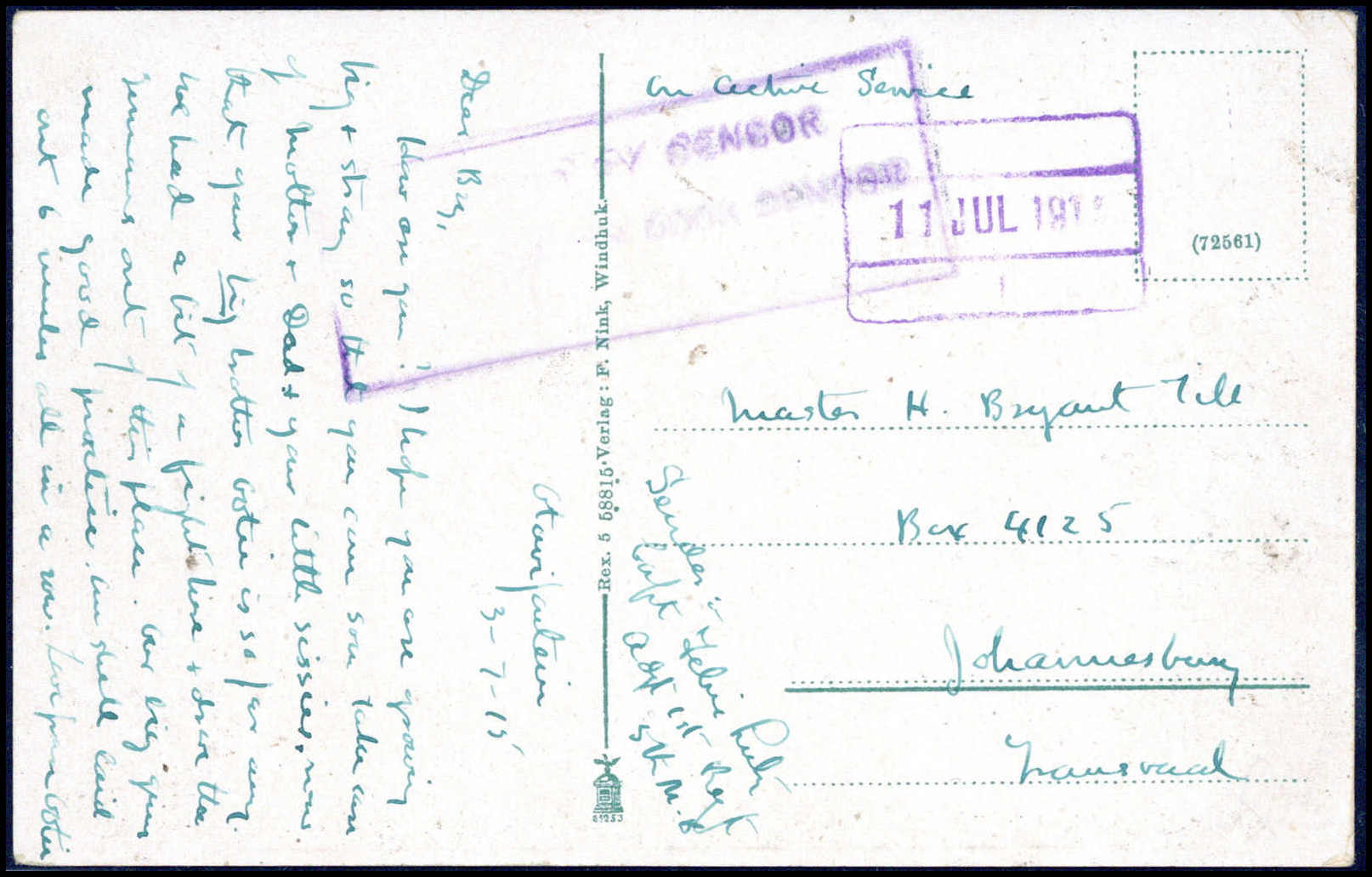Otavifontein, violetter Kastenstempel mit undeutlicher Nummer auf zensierter Ansichtskarte "On Active Service" aus Otavifontein 3/7/15 nach Johannesburg. Die Kapitulation der Deutschen war erst am 9/7/15 erfolgt