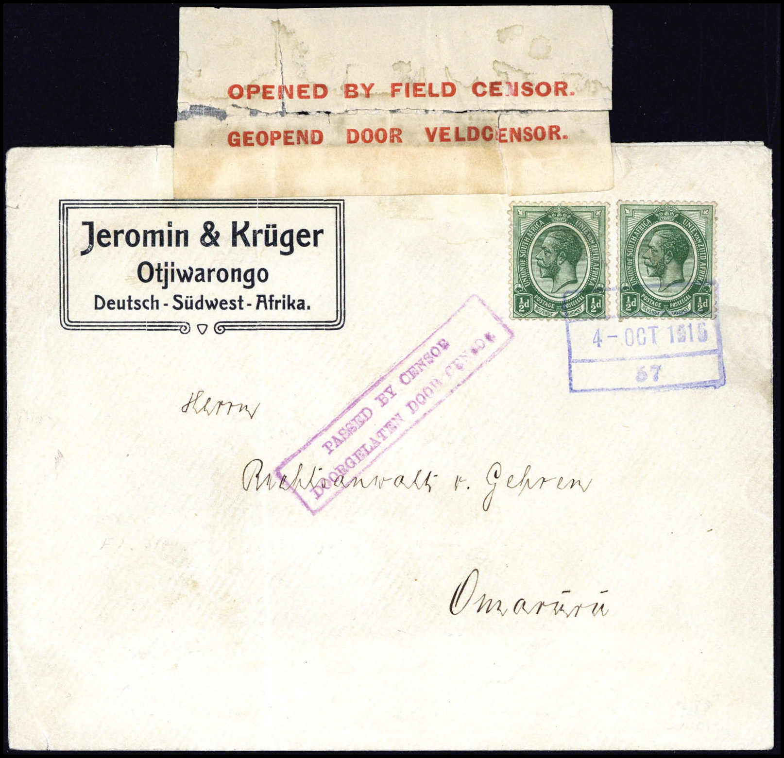 Otjiwarongo, violetter Gummikastenstempel "57", 4/10/15 auf zwei 1/2 d. auf zensiertem Firmenumschlag mit Zensurzettel "FIELD CENSOR" oben nach Omaruru. Seltene, frühe Zivilpost