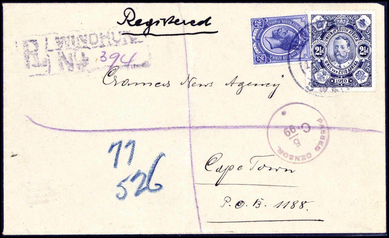 Parlament 2 1/2 d. mit Freimarke 2 1/2 d. mit K2 "WINDHUK S.W.AFRICA" 2/1/18 auf zensiertem, eingeschriebenem Umschlag nach Cape Town. Auf Brief zumal wie hier Bedarf sehr selten. SACC ohne Preis