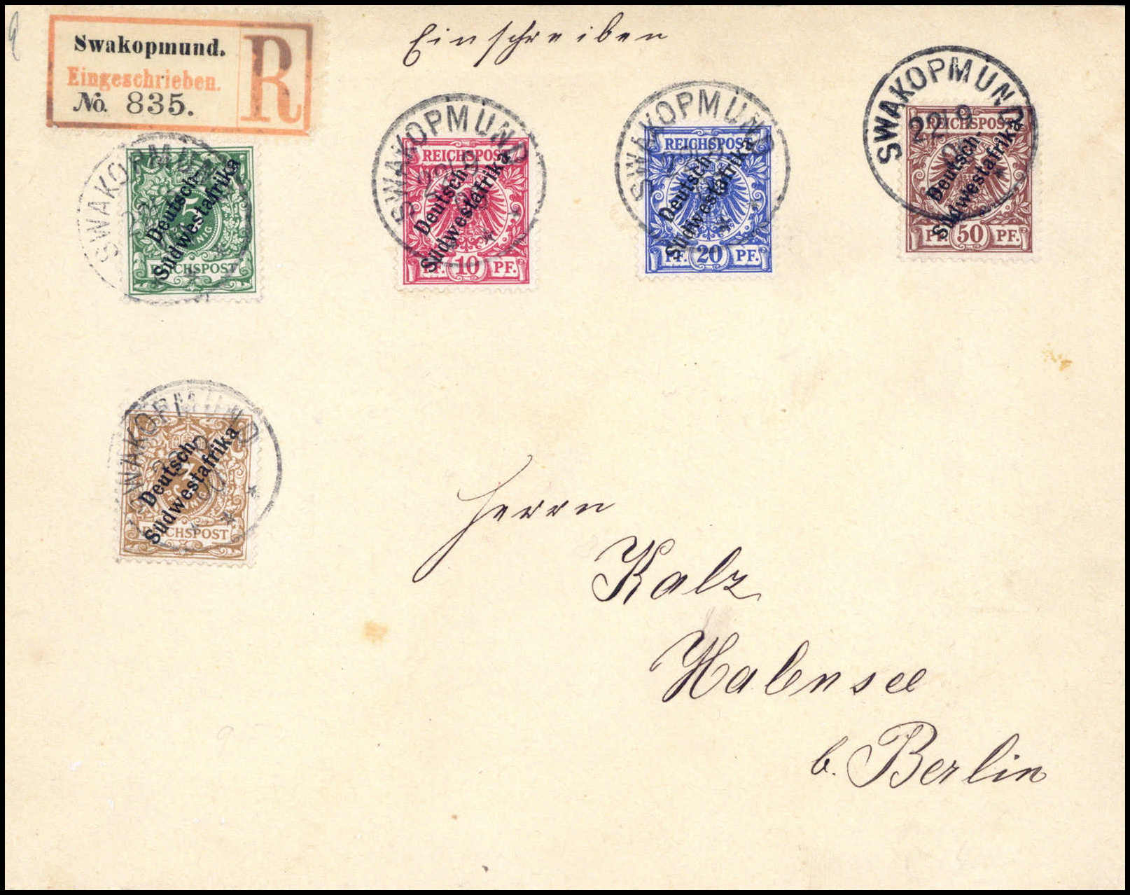 1900, 3 Pf. - 20 Pf., 50 Pf. mit Schrägaufdruck "Deutsch Südwestafrika" auf Einschreiben aus Swakopmund nach Hallensee bei Berlin